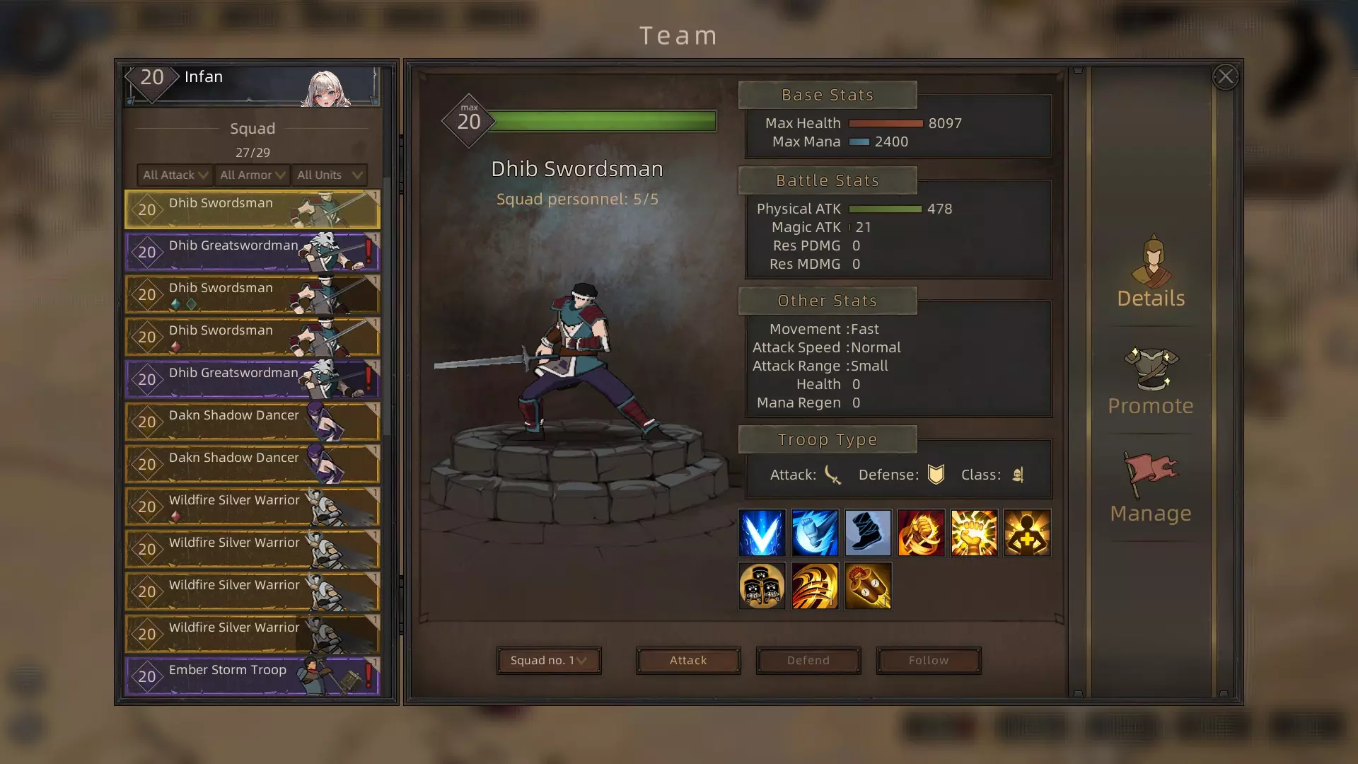 晋升树 瑟族平民 > 瑟族战士 > 瑟族民兵 > 瑟族掠夺者 > 瑟族突袭者 > 瑟族好战者 获取方式 你可以在暗影悬崖的任何城镇招募瑟族平民。注意:在没有模组的情况下,你需要加入瑟族并达到3级,才能将瑟族突袭者晋升为好战者。 评价 好战者是大多数关于强力单位的指南和讨论中都会推荐和提及的单位,这一点我完全理解。其高达776的攻击力,再加上技能【审判日】,使好战者成为致命的单位。如果你的军队中有几支这样的小队,你将能歼灭大多数敌军(注意:原版游戏对T6单位的数量有限制,但有模组可以解决这个问题,也有一些小技巧)。 迪布剑士