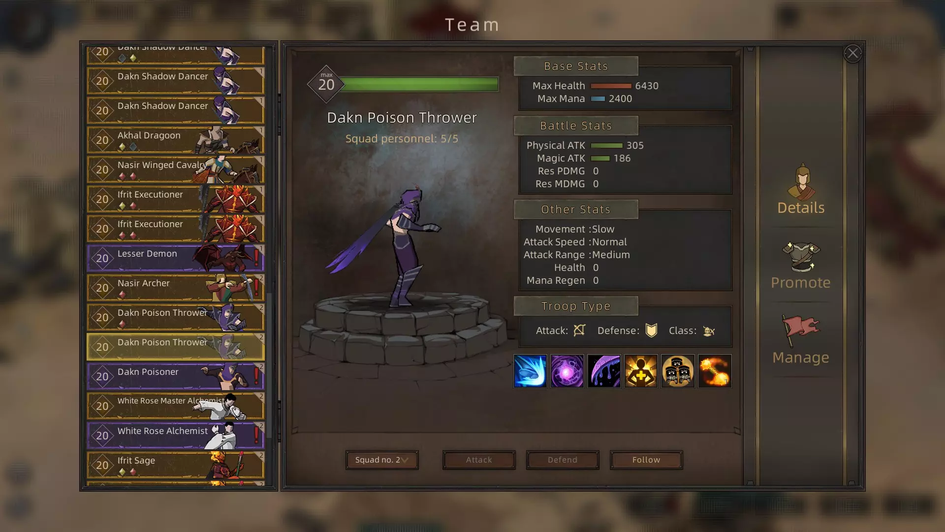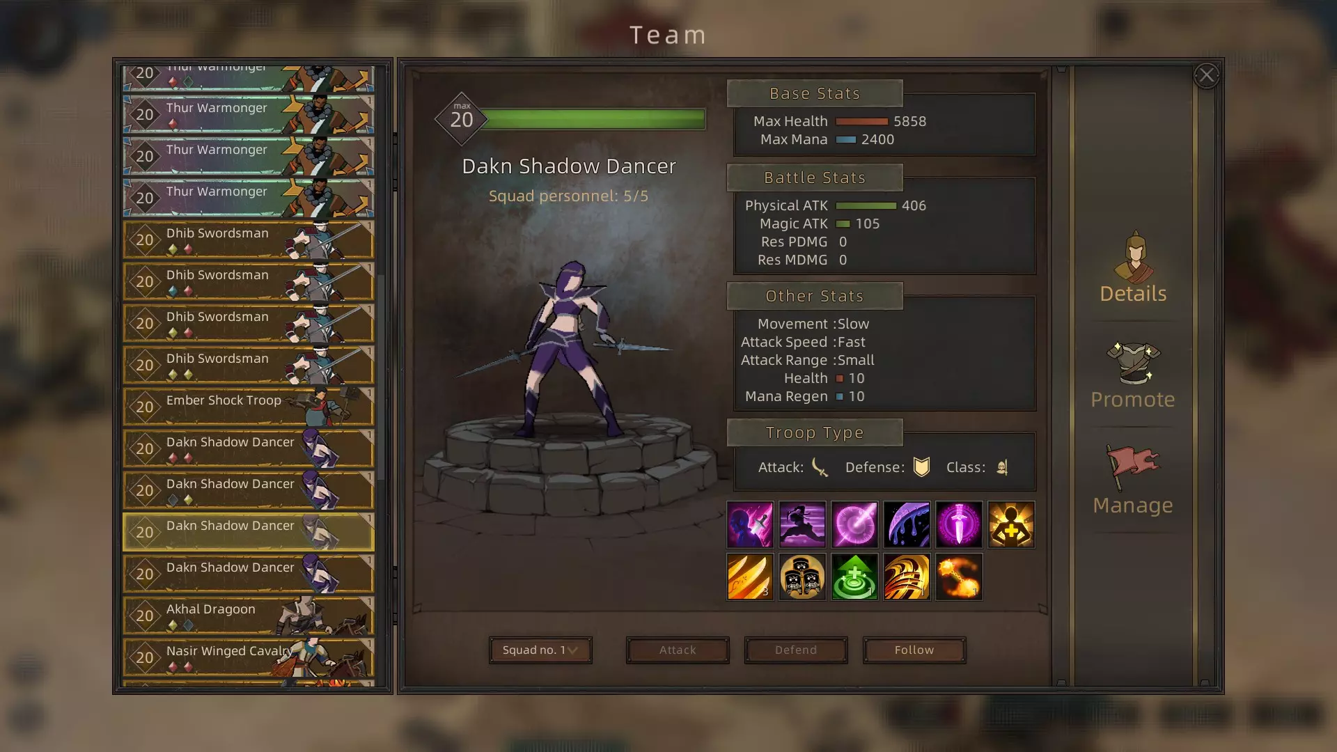 晋升树 达克妮少女 > 达克妮密探 > 达克妮杀手 > 达克妮潜行者 > 达克妮暗影舞者 获取方式 达克妮少女可在哭泣岩的任意城镇招募 评价 速度极快,攻击尚可。达克妮暗杀III是强大的单体攻击技能,能与任何可使敌人中毒的单位(如达克妮远程单位)完美配合。 达克妮投毒者