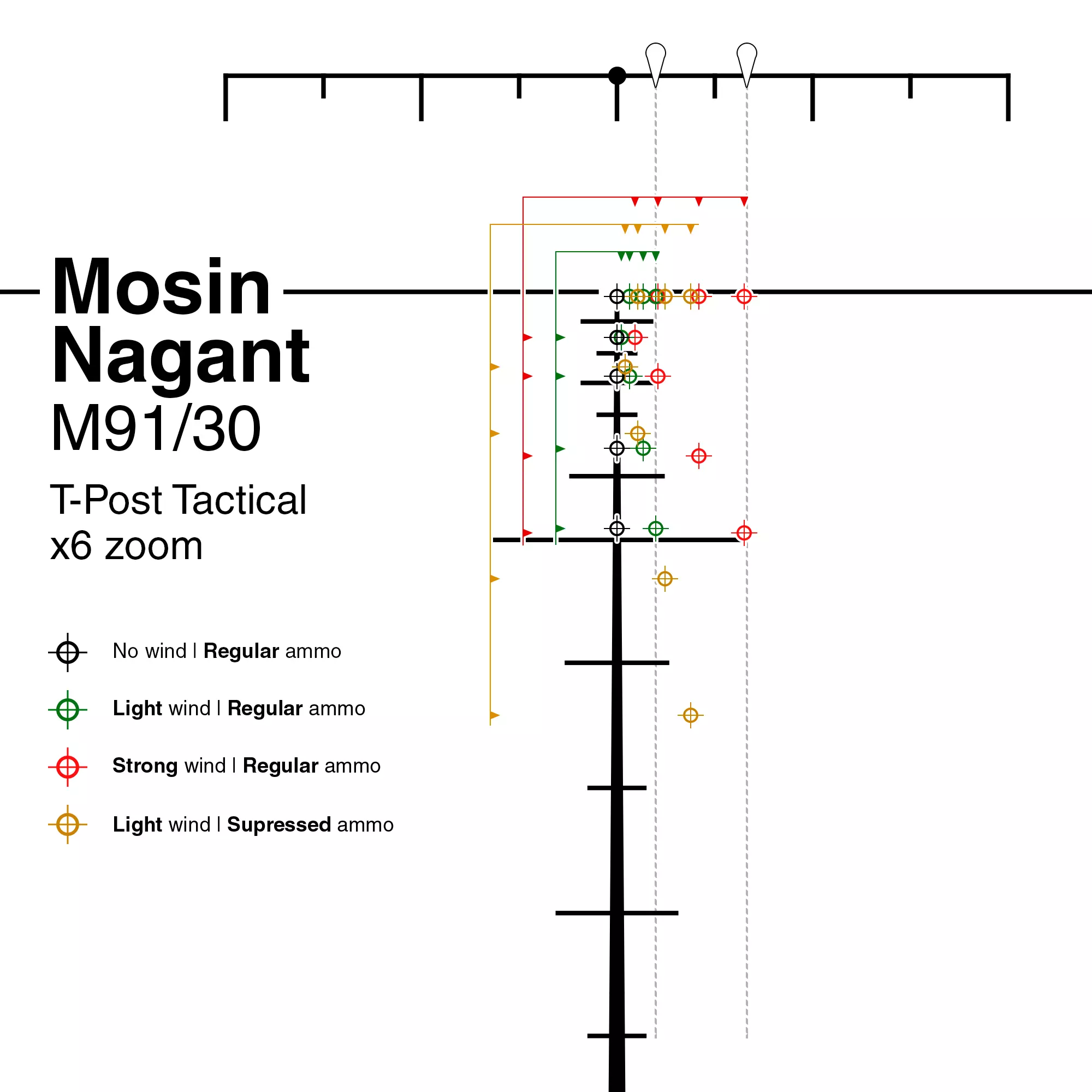 Still having problems hitting your target? Finding Authentic mode to be a bit too much? Never fear, Trip Hazzard is here with your definitive guide to shooting Nazis in the head. After all, the only good Nazi is a dead Nazi! This guide provides scope zeroing for the unmodified Carcano and Mosin and also includes an upgraded Springfield so that you can see the difference that muzzle velocity makes when factoring in distance and wind. I've only included these rifles as everything else falls somewhere in the middle. If you get this, you'll be able to extrapolate to your rifle of choice and make your own guide (should you need it). About this guide This guide provides zeroed target indicators for three rifles for a variety of distances, wind strengths and ammo types. It is principally designed to demonstrate the difference that muzzle velocity and damage upgrades make to targeting in different environmental situations. Distances 50m unadjusted 100m unadjusted 200m unadjusted 300m unadjusted 100m range adjusted 200m range adjusted 300m range adjustedWindWind effects tested were light and strong Ammo Regular ammo was tested at all distances in light and strong winds Suppressed ammo was tested at all distances in light winds onlyRiflesThere are charts for the following rifles only: Carcano M91/41 (unmodified) Mosin Nagant M91/30 (unmodified) M1903 Springfield (upgraded). The Carcano has the lowest muzzle velocity available (DLC excluded) and the Mosin has the highest. I’m not actually sure where the Springfield sits between these two as mine has been upgraded after my initial playthrough. I was lazy when I started and kept the default Springfield, and while it is a fine weapon, with hindsight I would now start with the Mosin and get the additional zoom and power for long shots. That said, if you look at the upgraded Springfield’s chart, you’ll see that it far out performs any unmodified rifle, and this would also be the case for any other upgraded rifle in the game. All tests were performed on the Shooting Range on Authentic (Hardcore) mode* In this mode, the Mosin and Carcano are fixed at 6x zoom and the Springfield is fixed at 4x zoom. Each chart has quite a lot of information and can seem confusing at first, but once you know what you’re looking at I hope that they will be useful at making you badass at shooting Nazis in the head. Target markersEach chart shows a T-Post Tactical scope and a wind meter. The wind meter has indicators for light wind and strong wind. The T-Post has target markers for 25 shots (26 if you include the 0m baseline marker): Suppressed ammo with light wind @ 50m, 100m, 200m and 300m unadjusted, and @ 100m, 200m, and 300m adjusted Regular ammo with no wind @ 50m, 100m, 200m and 300m unadjusted Regular ammo with light wind @ 50m, 100m, 200m and 300m unadjusted, and @ 100m, 200m, and 300m adjusted Regular ammo with strong wind @ 50m, 100m, 200m and 300m unadjusted, and @ 100m, 200m, and 300m adjusted Each marker is where you need to aim if you want to shoot someone in the head. If you would prefer to shoot people in the testicles, you will need to make your own appropriate adjustments. Colour coding Suppressed ammo is orange No wind is black Light wind is green Strong wind is redThe colour coded triangular marks across the top of the T-Post show wind drift for each ammo type at different wind strengths The colour coded triangular marks down the side of the T-Post show drop for each ammo type at different distances (50m, 100m, 200m and 300m) FinaleI didn’t include any shots over 300m. If that’s your thing then you either already know what you’re doing and you don’t need this guide or you’re insane. I hope this helps. Now go be badass and shoot some Nazis in the head (on Authentic* mode) * If you are not playing on Authentic (Hardcore) mode yet, stop what you are doing and change the difficulty setting. The aiming assists, minimap, target markers and all the other bells and whistles that Sniper Elite (Hard) mode provides completely destroy any immersion or authenticity in the game. Sniper Elite mode isn't hard, it just throws a lot of bad guys at you to make up for all the assistance you receive. Playing on Authentic (Hardcore) mode is like playing a different (and much better) game. Carcano M91/41 | unmodified | T-Post Tactical | 6x zoom