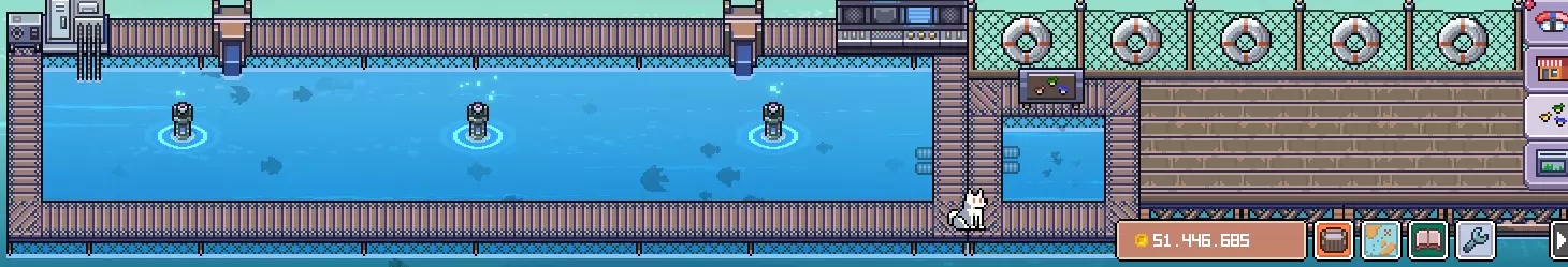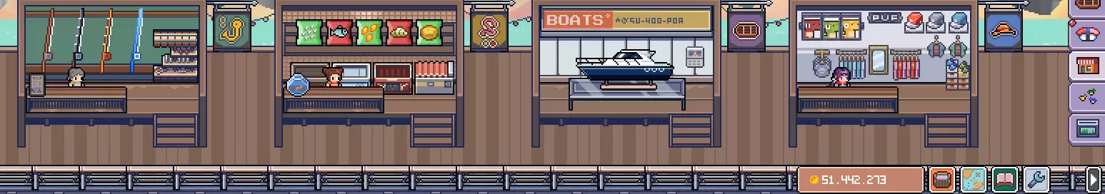 游戏的基础场所,每次点击或键盘输入都可以提高鱼上钩的概率,点击人物可以加速行动。收鱼时可以长按鼠标滑动,快速收完积累的鱼。可以点击右下按钮只保留渔船本身。左侧会出现随机事件,可获得金币或鱼,当右侧地图图标上出现红色的点时,代表有随机事件生成。随机事件最小化后也会显示在桌面上。【萌新的第一桶金】【寿司店】