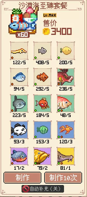 其他菜单在这个面前都是弟弟 在解锁这个菜单之前,大量繁殖传说鱼,多做传说鱼菜单。这样寿司店收入比较可控的同时可以培养异色鱼。 赚钱指南 遇到鲸鱼之后,你就获得了初始资金。早一点解锁完地图,因为后面的地图所有菜品都比前面的地图贵。多升级菜谱使得收益最大化。不要在仓库里卖鱼,仓库没有上限可以留着喂猫或者做菜。解锁后期菜单会非常缺低级鱼!记得给水族馆喂食,水族馆收益是金币主要来源之一。