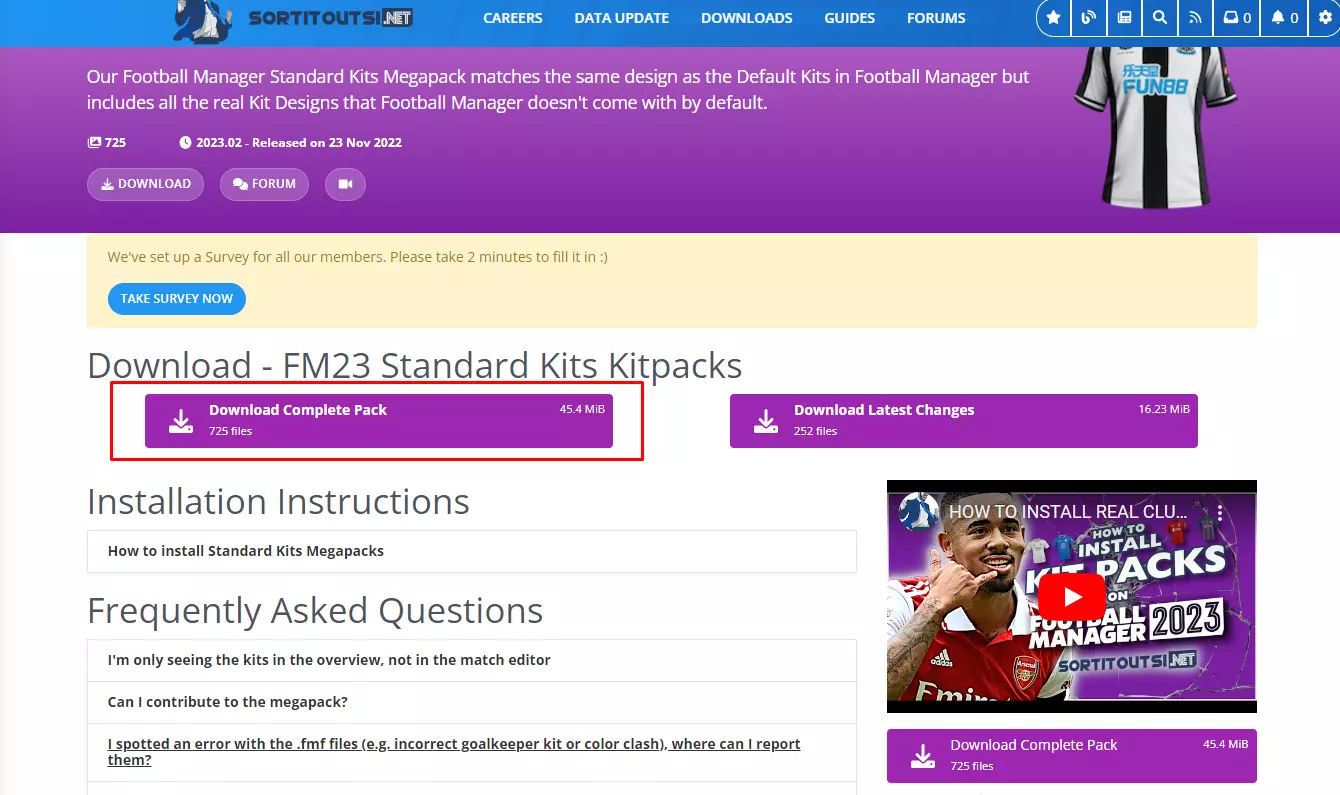 你刚刚加入《足球经理2023》社区吗?那么这份指南就是专门为你准备的! 前言 很可能在这款模拟器中游玩几个小时后,你会发现大多数球员都没有面部,取而代之的是黑色剪影,而球队的队徽和球衣也被随机选择的徽章所替代,这些徽章只是在颜色上与真实队徽相似。这确实是个令人不快的情况,但我们将一起解决这个问题! 1.需要下载包含面部、徽章和球衣的数据包。以下是下载链接,其中第一个网站的面部和球衣数据包需要简单注册。 1.1 面部数据包 面部数据包 - 点击此处(首先点击“Download Complete Pack”,然后需要向下滚动页面,那里会有种子文件的下载链接)