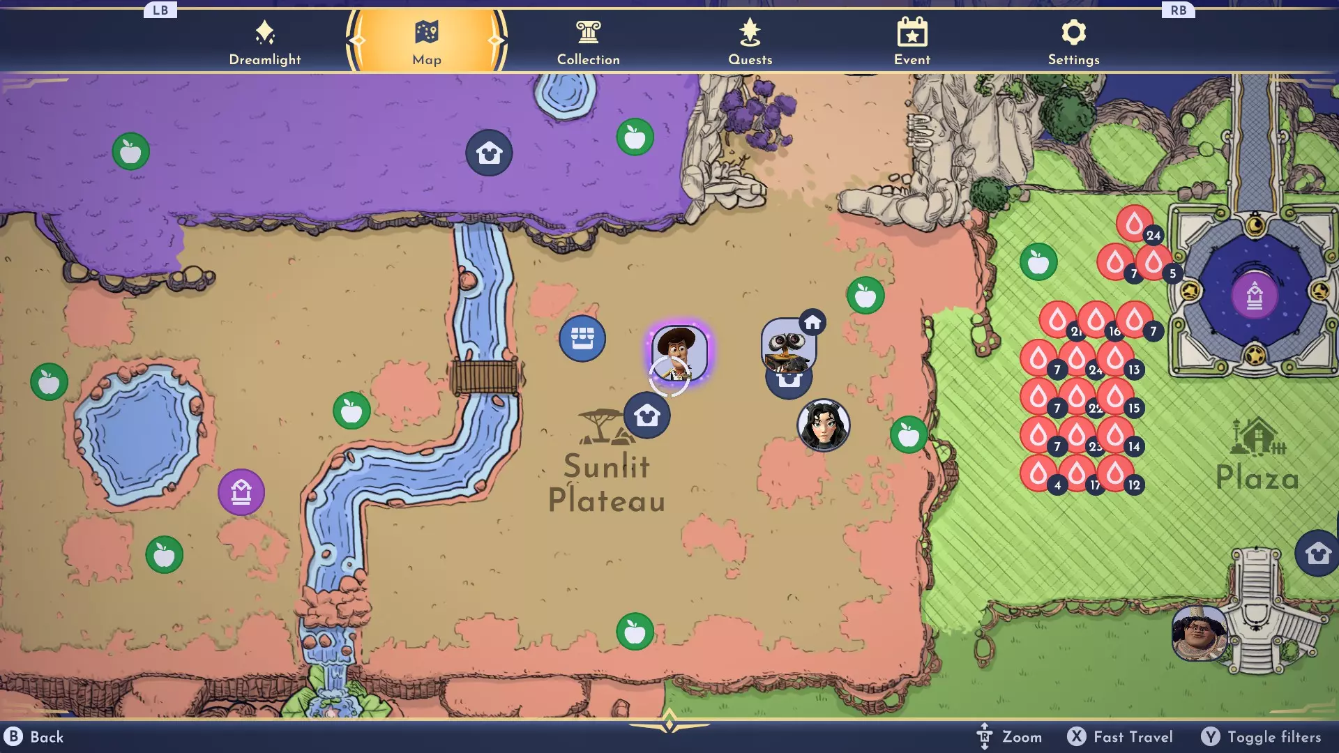 此外,可以考虑将所有灌木和树木集中起来形成一个果园,以便快速采集。根据我的经验,游戏中有6棵可可树、柠檬树和樱桃树;5棵苹果树和香蕉树;3棵椰子树(解锁后);6丛覆盆子和醋栗灌木;5丛蓝莓灌木。 地图追踪 你是否曾经在寻找像雷米或巴斯这样的小角色时,却怎么也找不到他们?或者你查看地图后发现要找的村民远在霜寒高地,于是你从森林跑过去,结果却发现他们现在在海滩上?其实,有一个简单的解决办法。