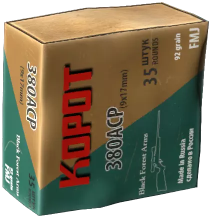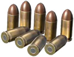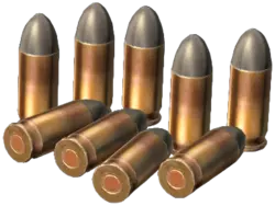 .380 ACP手枪弹。用于部分手枪和冲锋枪。 伤害:21 冲击:33 流血:100 重量:小于0.25千克 占用格子:1x1