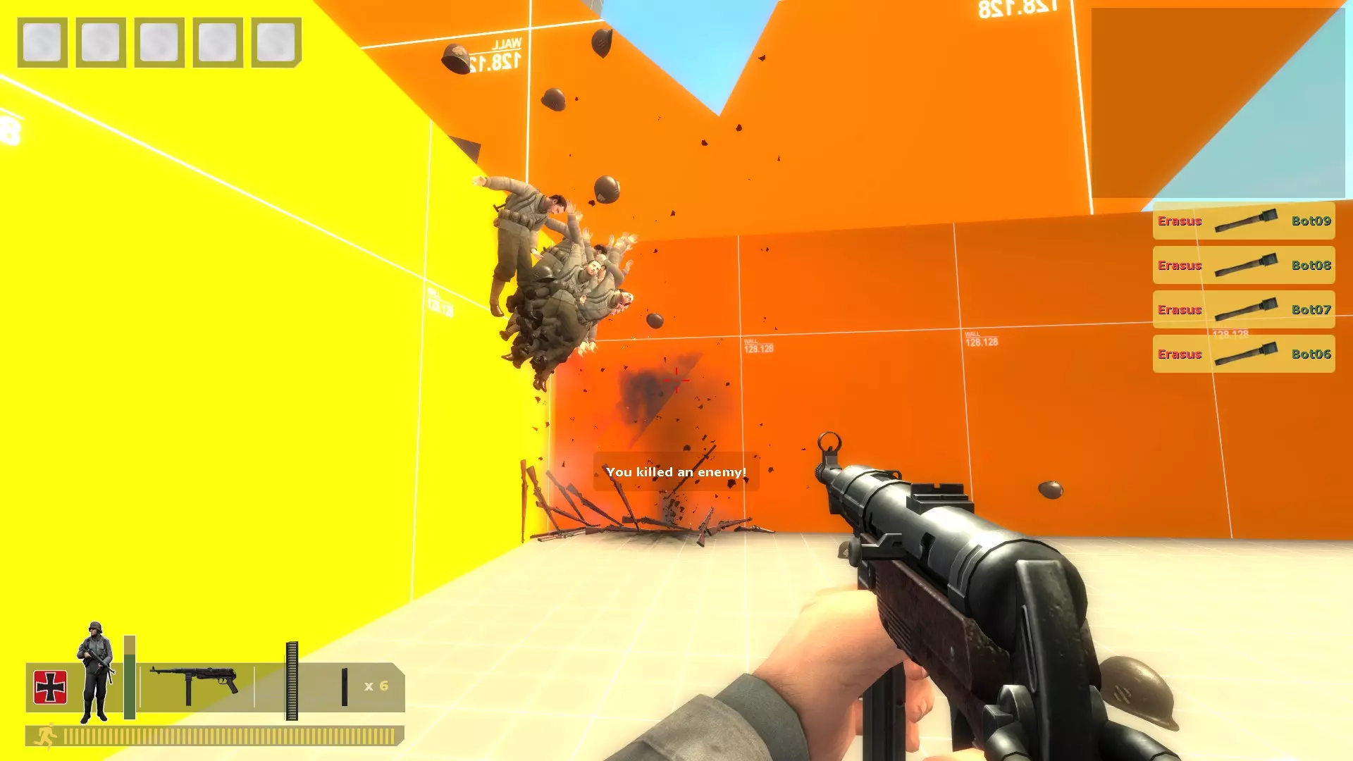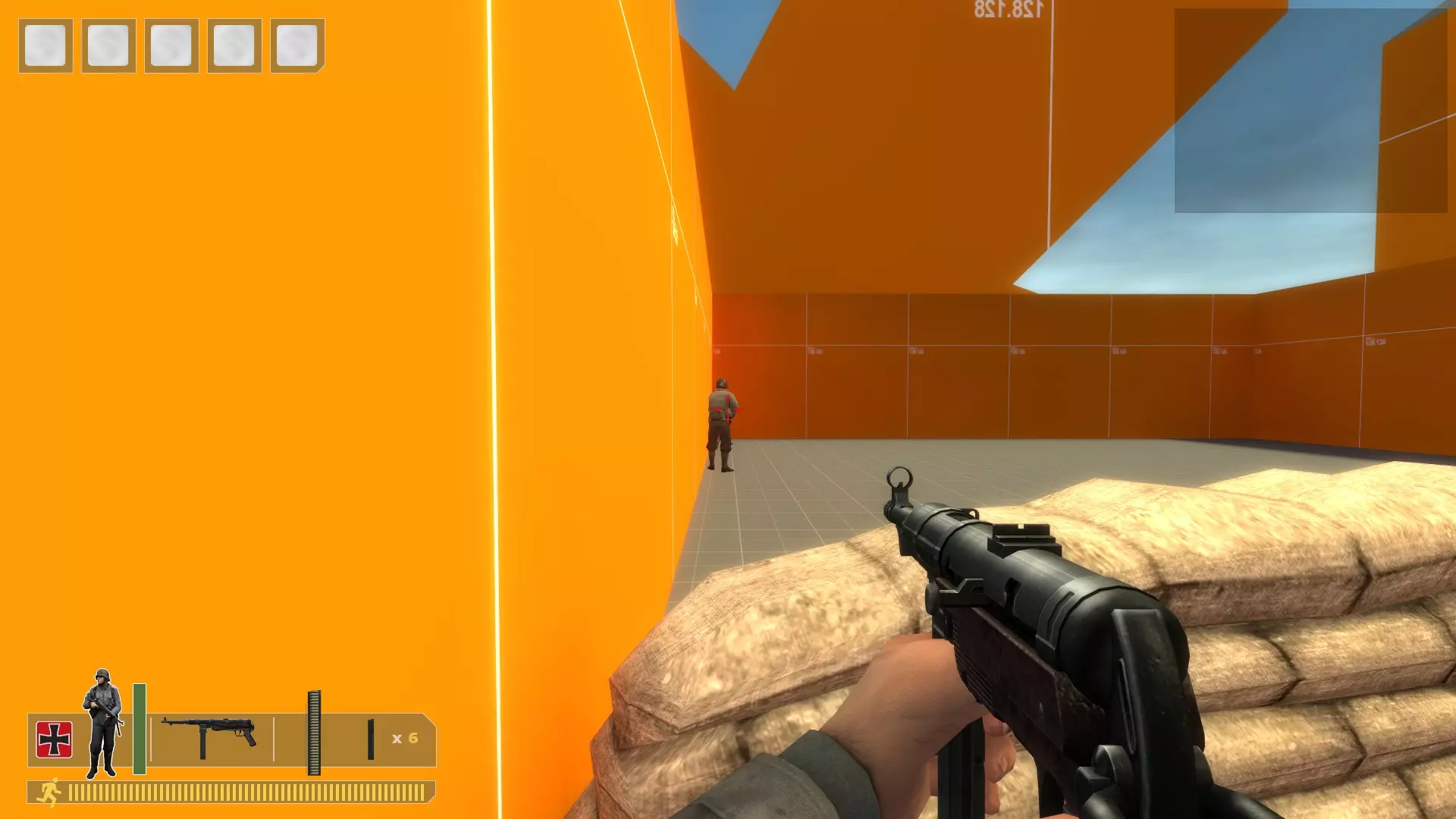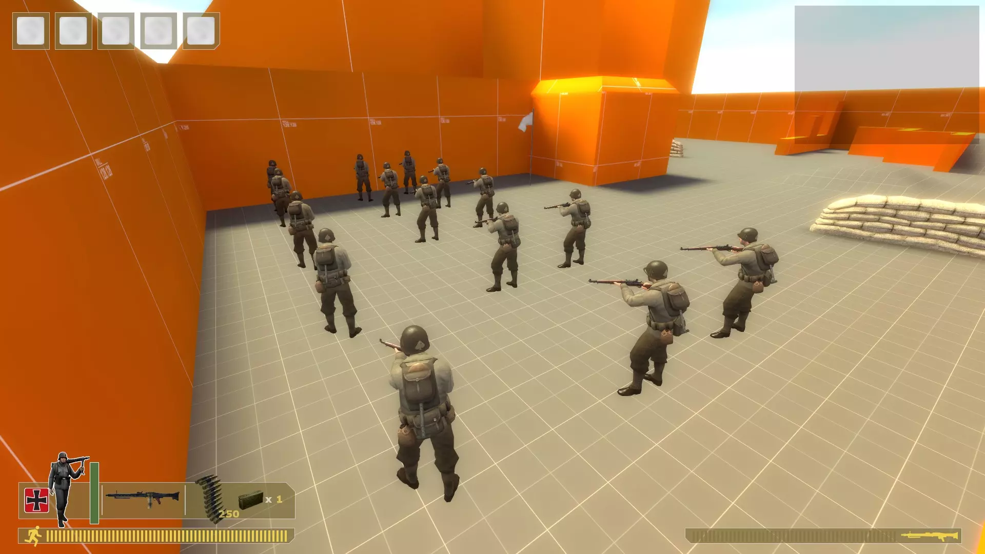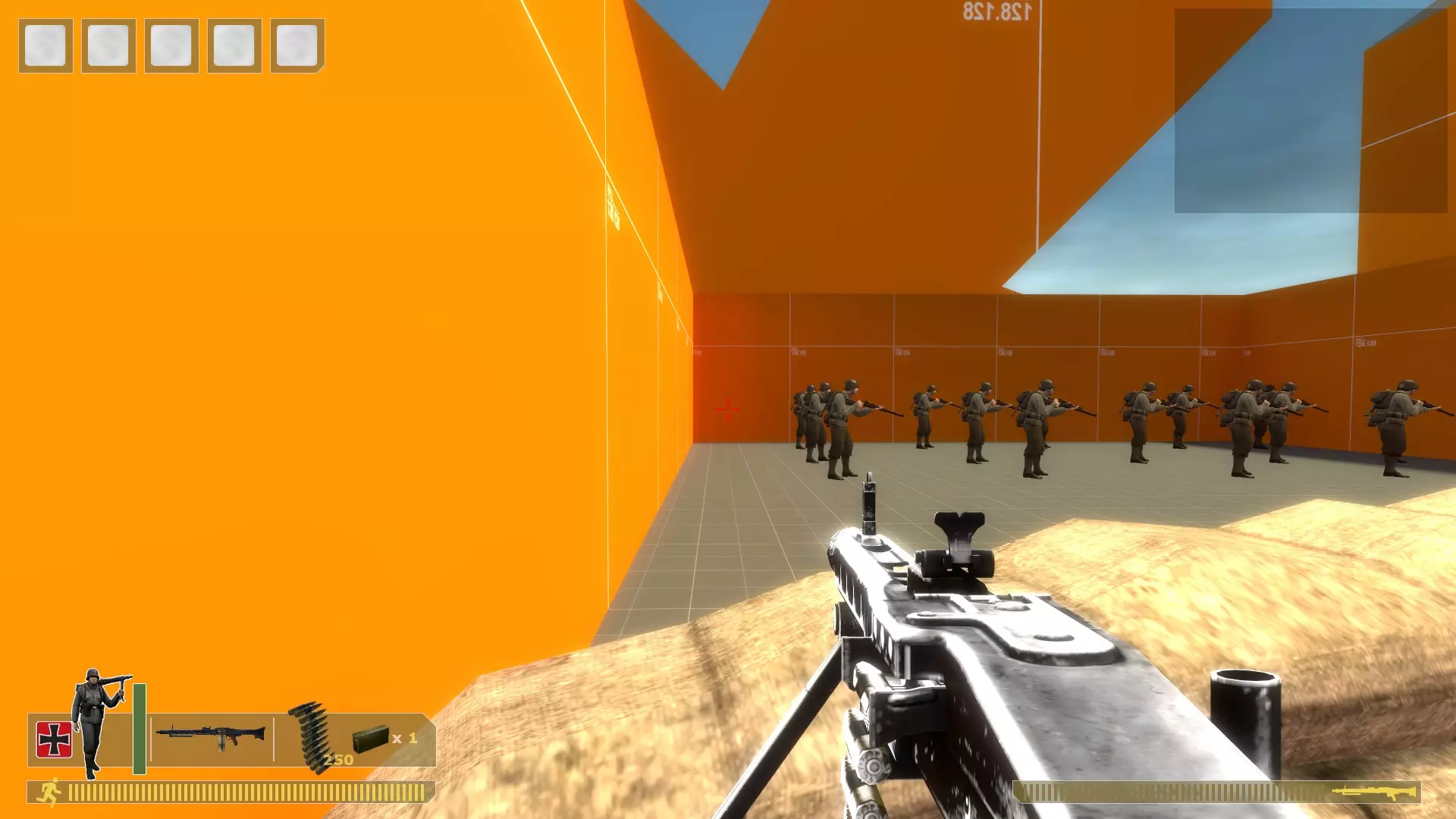 用你需要的任何枪支、手榴弹或火箭筒将他们扫倒。重复此操作。 无法补充弹药,所以当你弹药耗尽时,在控制台输入kill。 对于机枪: 在沙袋上架设,使用bot_mimic 1命令,按住A键来聚集机器人。