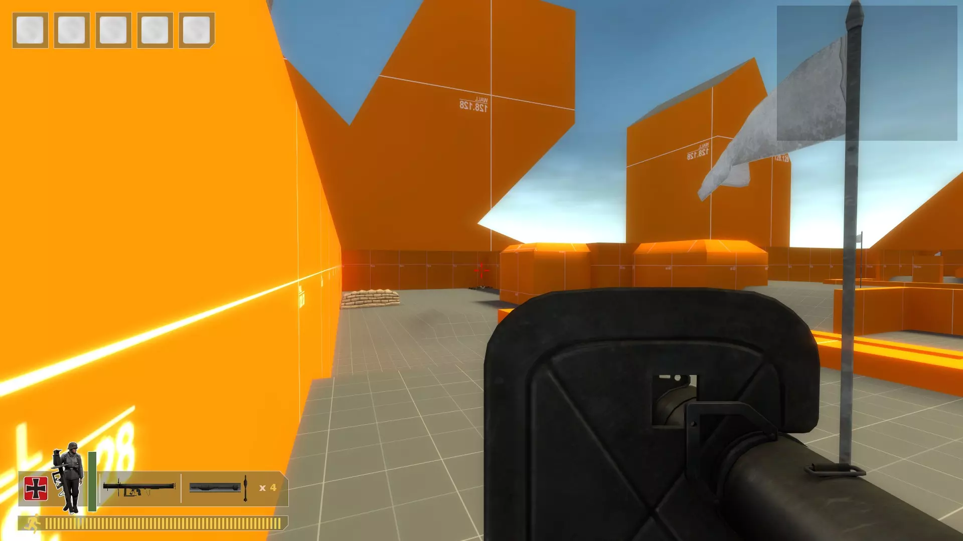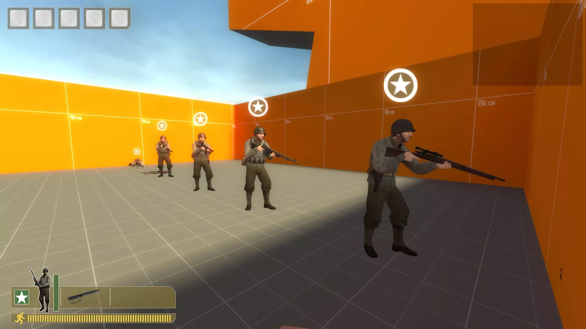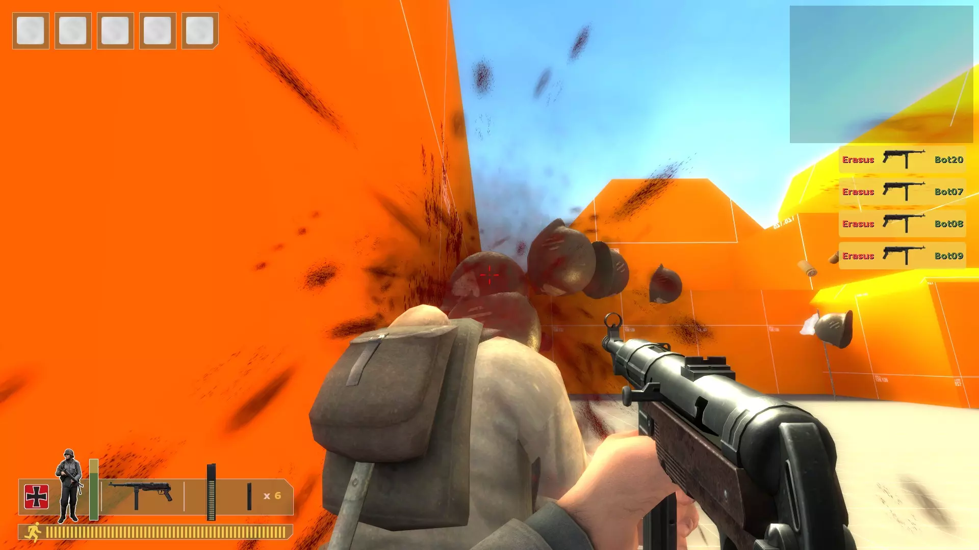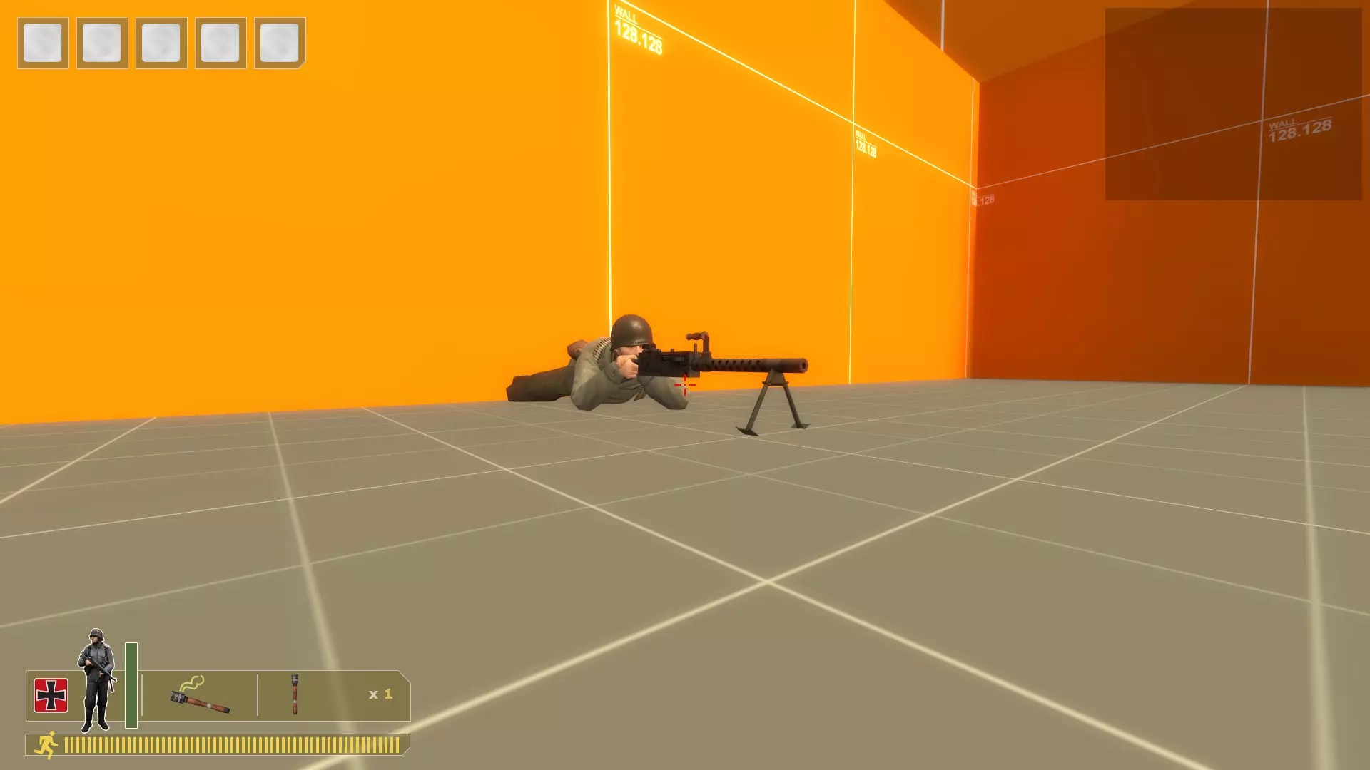 用你需要的任何枪支、手榴弹或火箭筒将他们扫倒。重复此操作。 无法补充弹药,所以当你弹药耗尽时,在控制台输入kill。 对于机枪: 在沙袋上架设,使用bot_mimic 1命令,按住A键来聚集机器人。