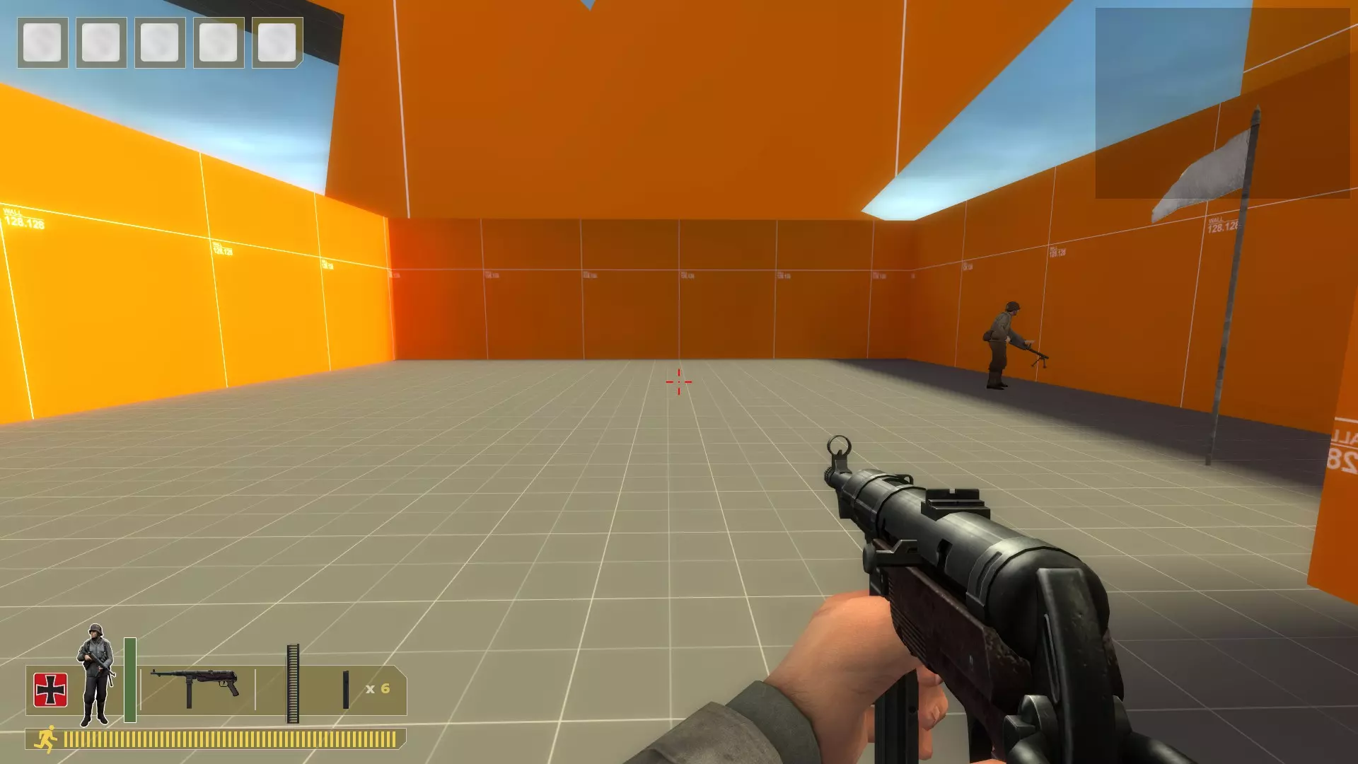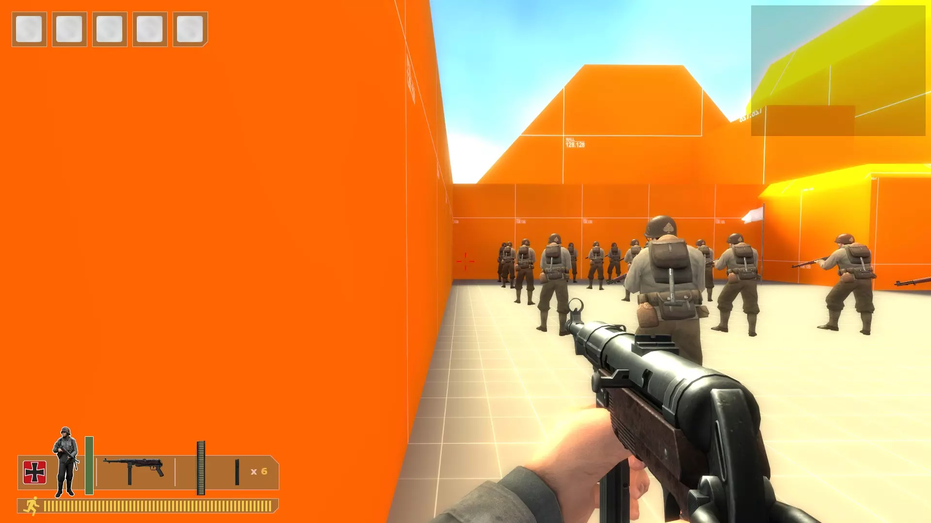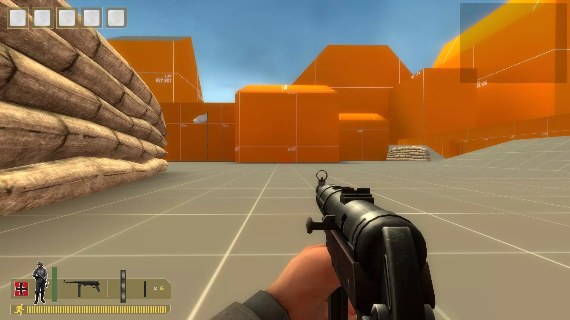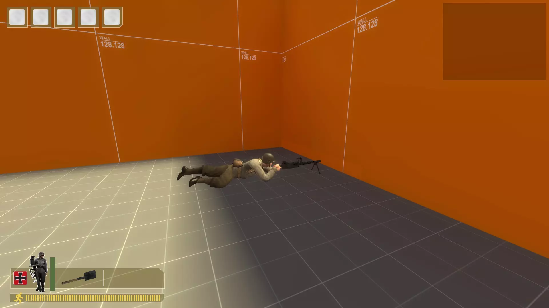 用你需要的任何枪支、手榴弹或火箭筒将他们扫倒。重复此操作。 无法补充弹药,所以当你弹药耗尽时,在控制台输入kill。 对于机枪: 在沙袋上架设,使用bot_mimic 1命令,按住A键来聚集机器人。