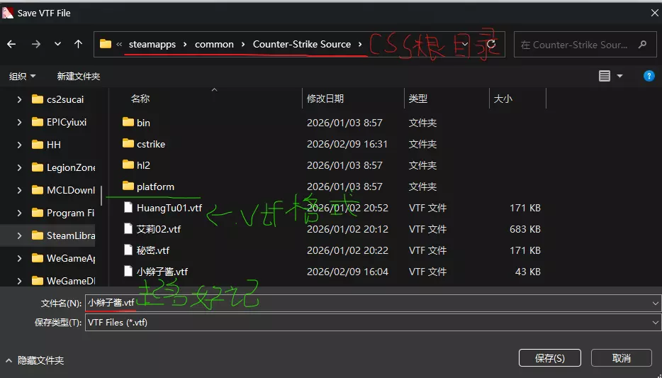 然后可以直接保存到【反恐精英:起源】游戏文件根目录里。文件名随便起个好记的。
