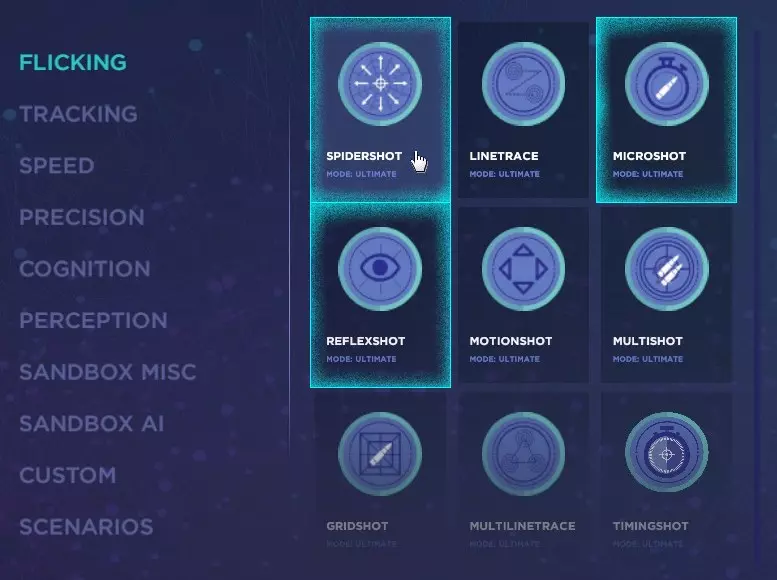 选择模式 现在你需要选择一些模式,以便解锁成就: 在Flicking标签页中,选择: Spidershot Microshot Reflexshot