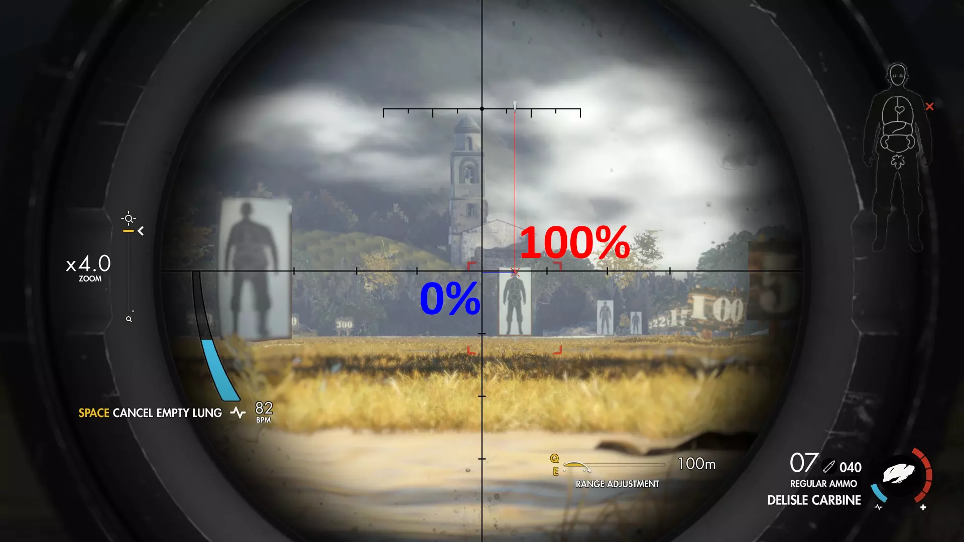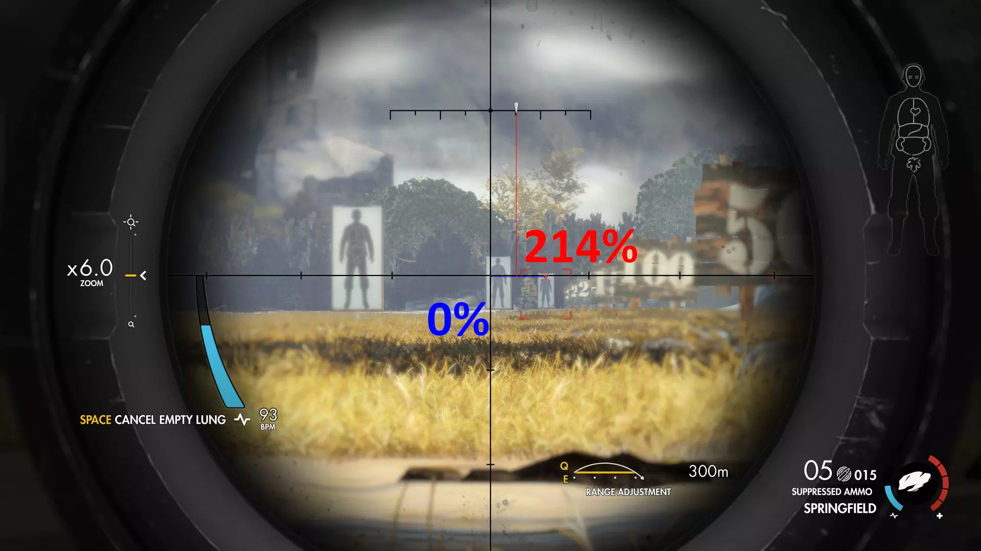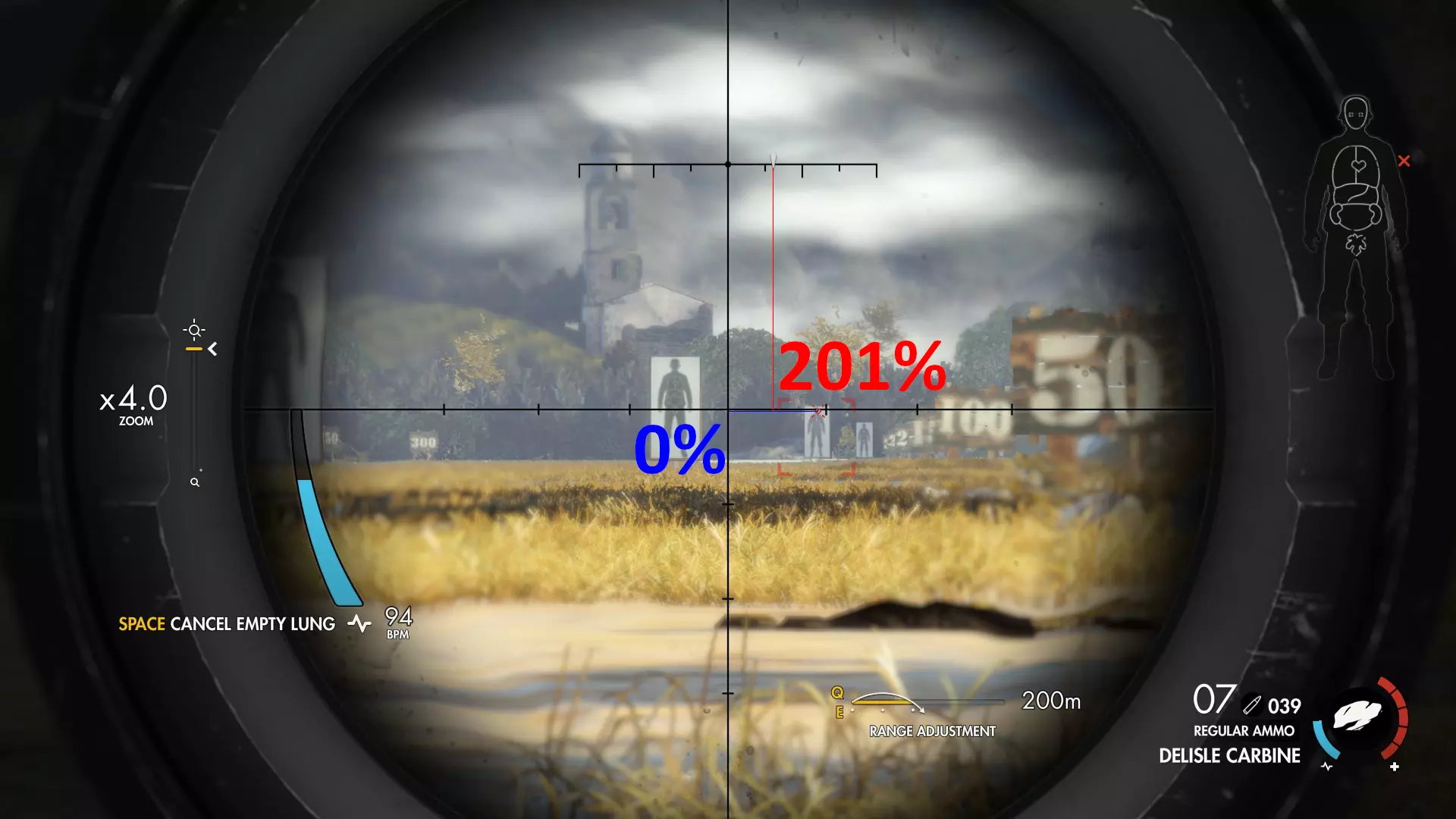 计算技巧 首先,我会在瞄准辅助完全锁定目标后,在特定距离处截图。 然后,我会在G.I.M.P.中打开截图,用纯蓝色评估高度损失,用纯红色评估风力影响。 之后,我使用G.I.M.P.中的计数工具统计总像素数,再用该工具统计实际像素量。 我根据这两个数值计算百分比。 最后,我将数值用相应颜色标注在截图上。