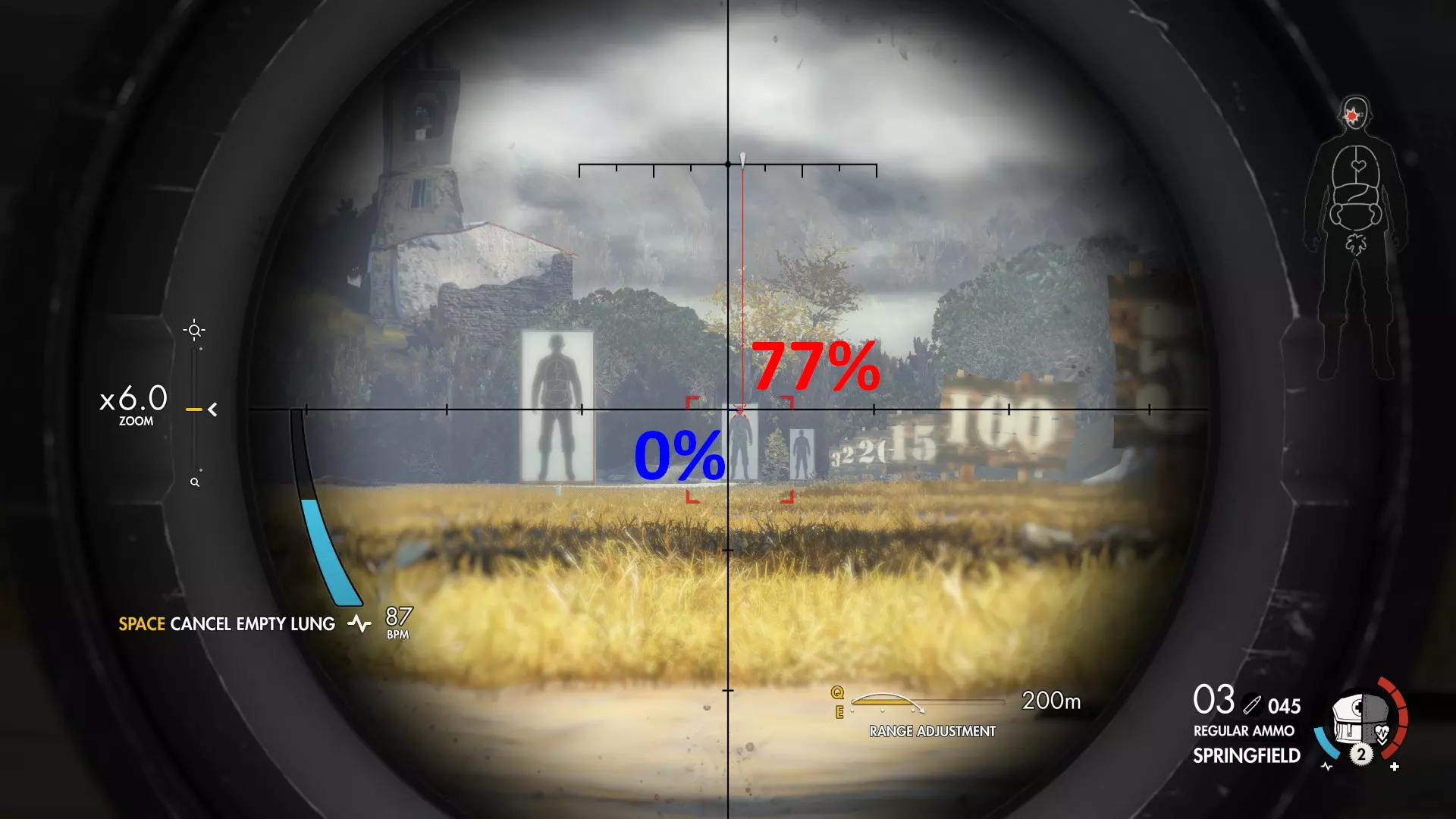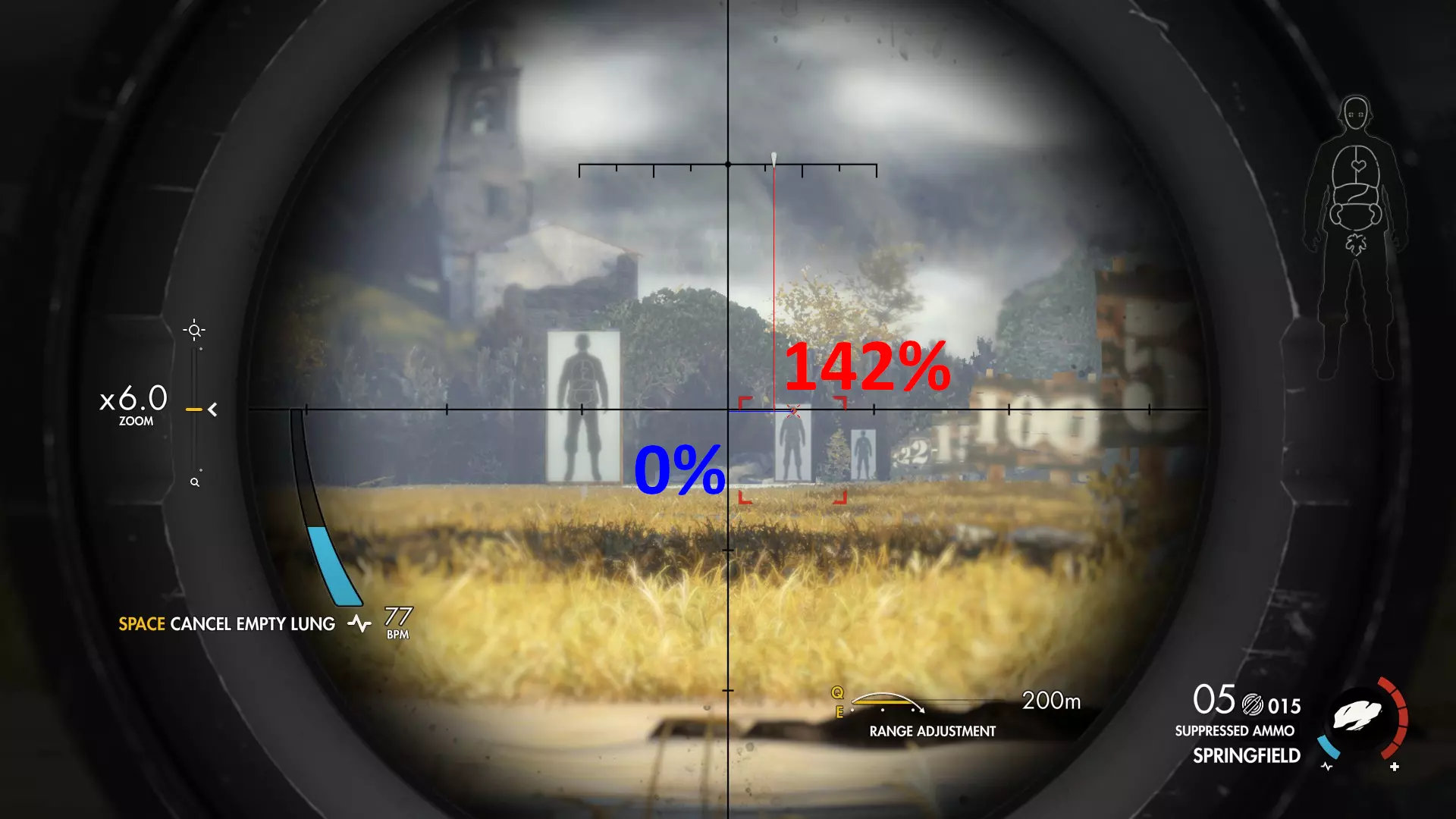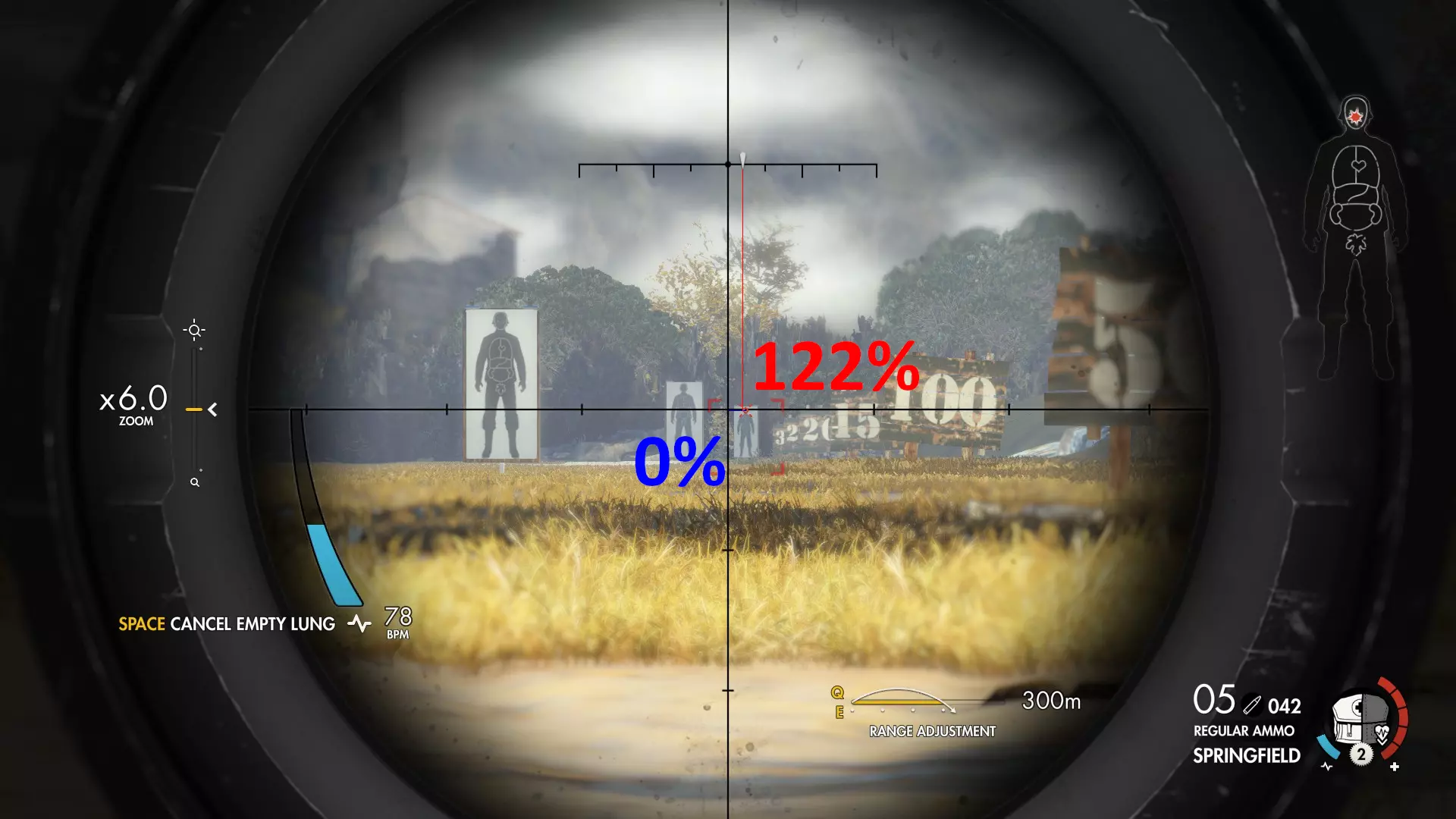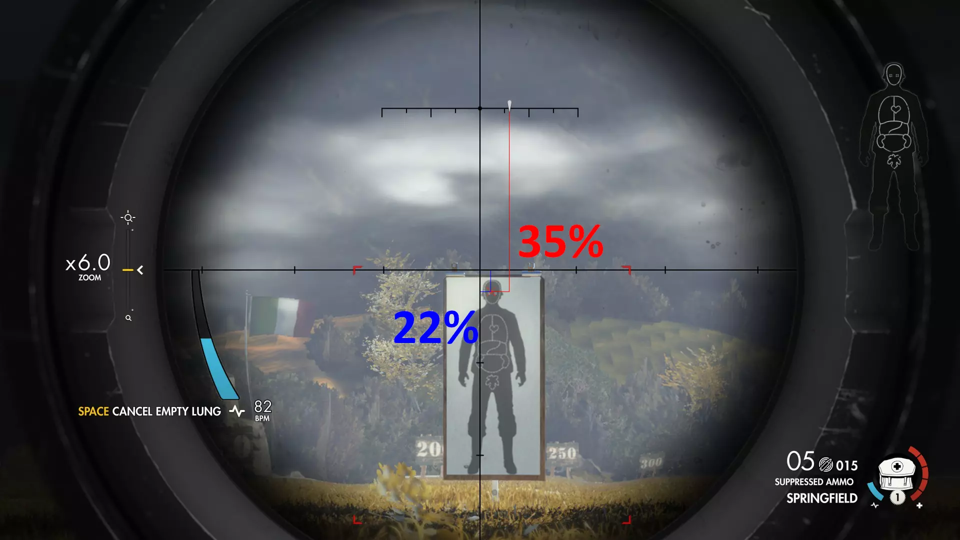 计算技巧 首先,我会在瞄准辅助完全锁定目标后,在特定距离处截图。 然后,我会在G.I.M.P.中打开截图,用纯蓝色评估高度损失,用纯红色评估风力影响。 之后,我使用G.I.M.P.中的计数工具统计总像素数,再用该工具统计实际像素量。 我根据这两个数值计算百分比。 最后,我将数值用相应颜色标注在截图上。