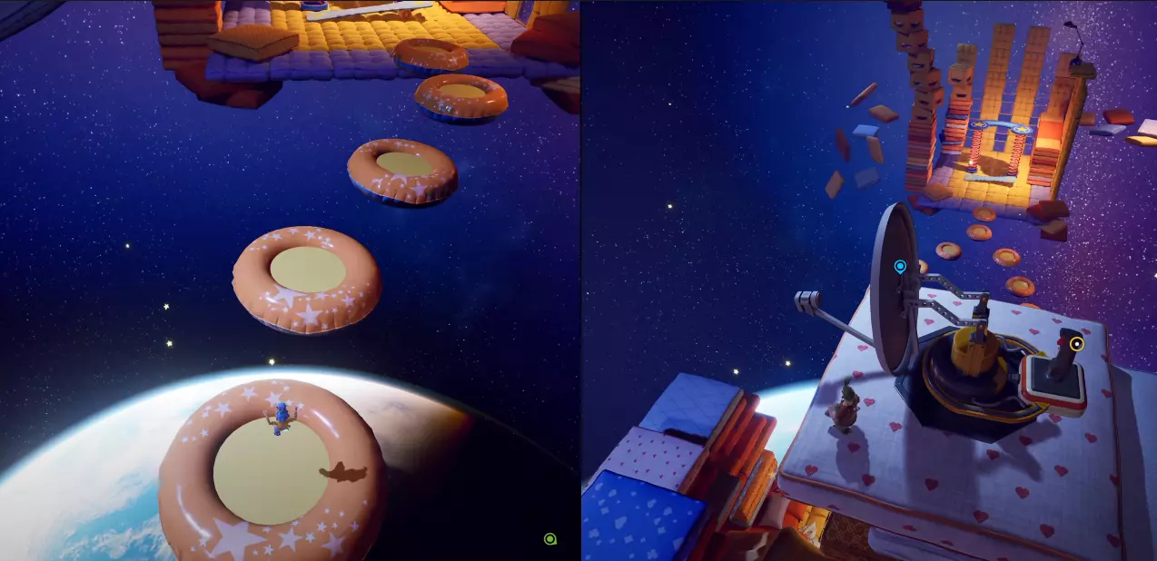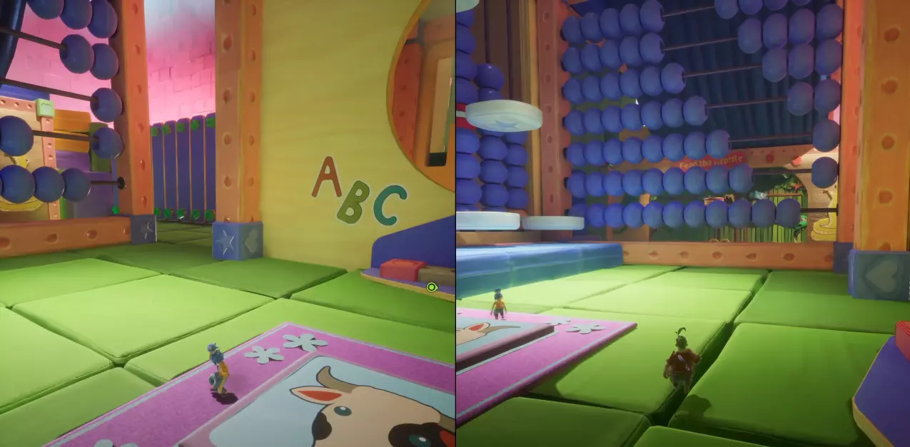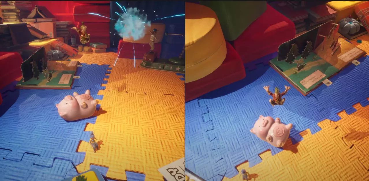 第三章:枕头 场景:枕头堡垒 小游戏:坦克兄弟 | 5/25 在场景开始时,我们进入房间,沿着黄色线缆前进,会遇到一些枕头楼梯,爬上去就能看到下一个小游戏。
