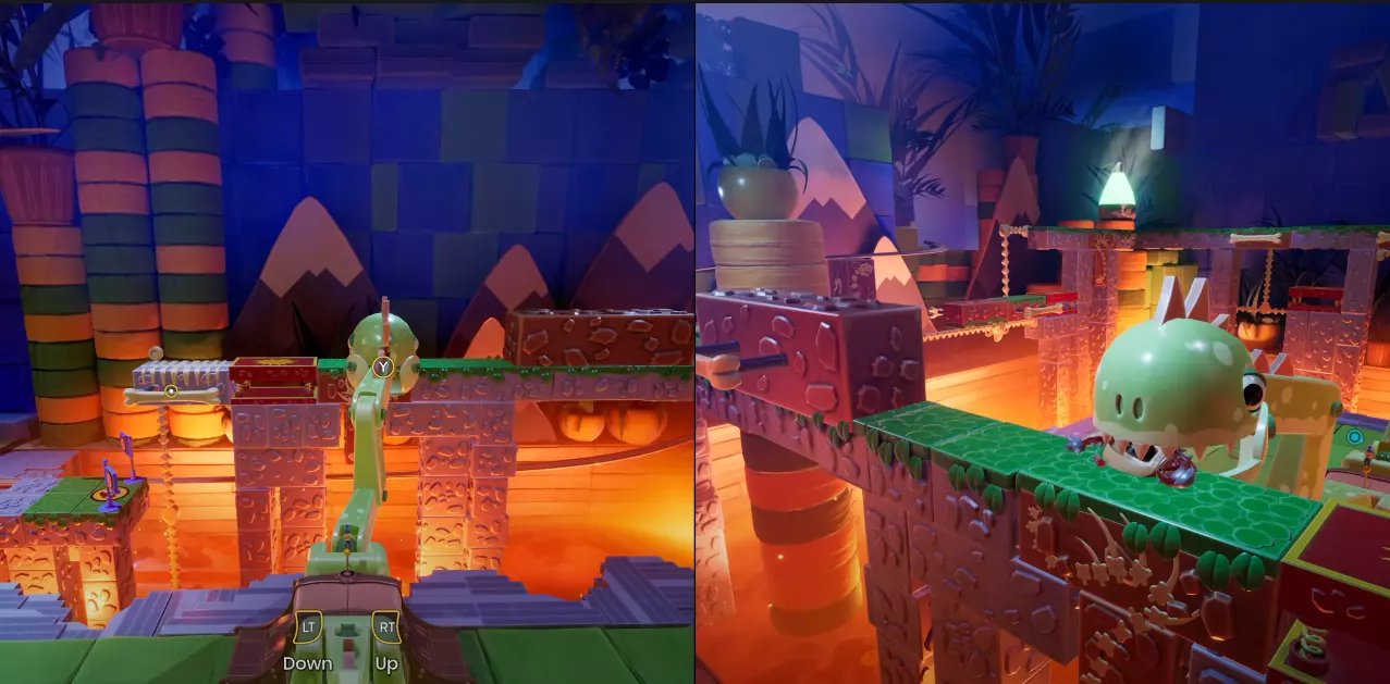 在使用恐龙时,控制绿色恐龙的玩家需要在白骨方块上吃掉骑乘红色恐龙的同伴,以获取下一个成就。