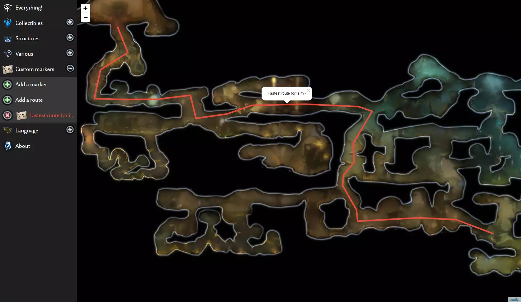 你可以通过鼠标或手指拖动地图进行探索,也可以使用滚轮、手指或右上角的按钮进行缩放。 请注意,地图会显示全部内容:因此如果你不想被剧透尚未发现的内容,最好避免查看地图! 默认情况下,地图上不会显示任何内容。若要显示所需内容,你需要在左侧菜单中选择相应元素(如截图所示)。 放置自定义标记和路线 你可以放置自己的标记和路线,它们会显示在地图上,并且会被保存,即使关闭页面后也会保留! 这对于速通或标记特定位置非常有用。放置标记的方法:点击左侧菜单中的【添加标记】,然后在地图上你想要放置标记的位置点击。系统会提示你选择标记图标和输入名称。 放置路线的方法:这会稍微复杂一些。点击左侧菜单中的【添加路线】。 一条路线由多个点分隔的线段组成。在地图上你想要放置这些点的位置点击(如果没有看到任何内容也不要惊讶,这是正常现象)。 当你想要放置最后一个点时,在你想要放置最后一个点的位置点击并按住。系统会提示你选择路线颜色和输入名称。 这就是我的意思(没错,这是一张画得相当快的草图^^)