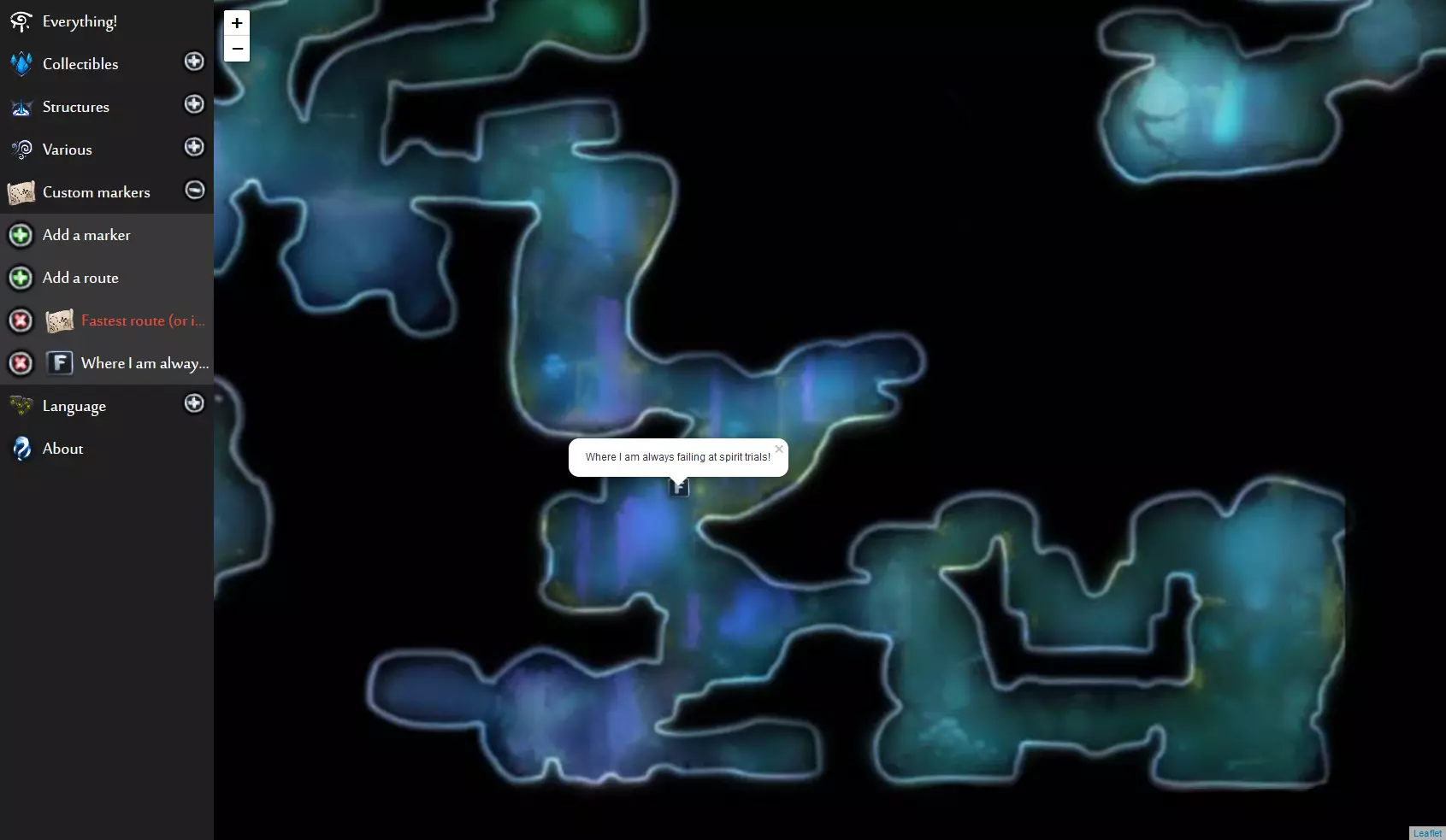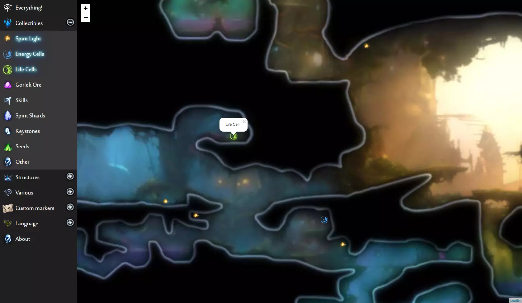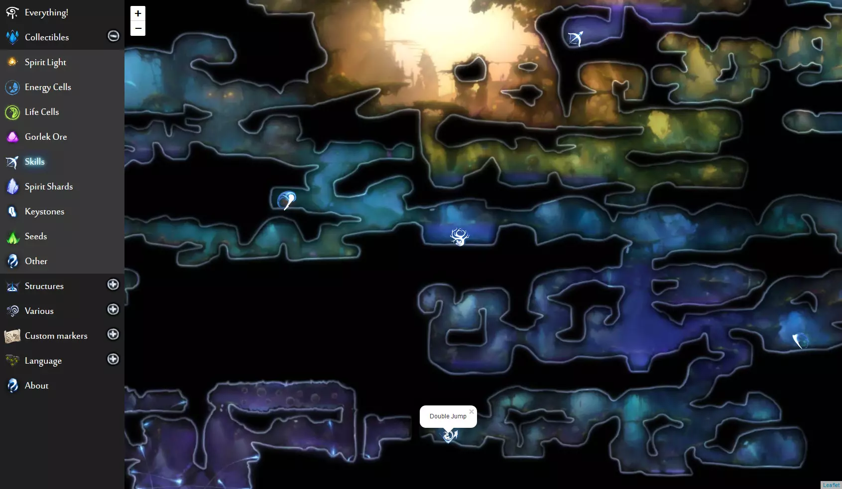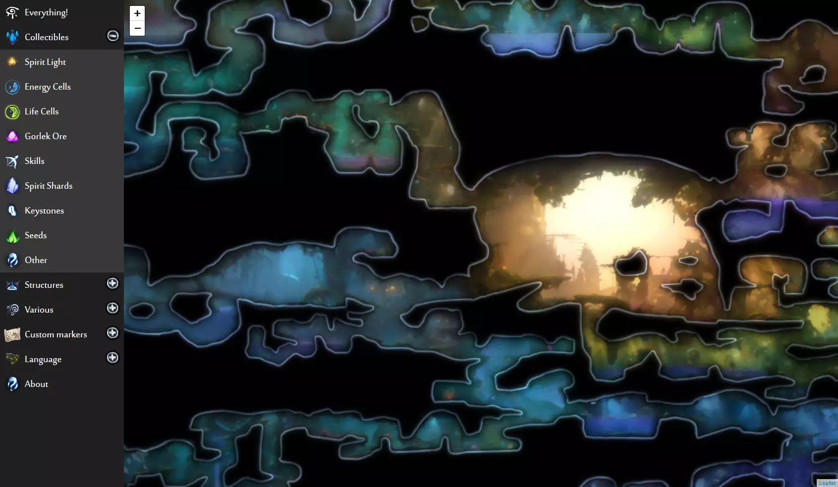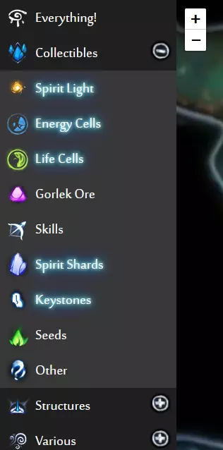 《奥日与鬼火意志》网页版交互式地图(谷歌地图风格)。地图上显示了所有单元格、物品、秘密等内容,帮助你找到所需的东西!