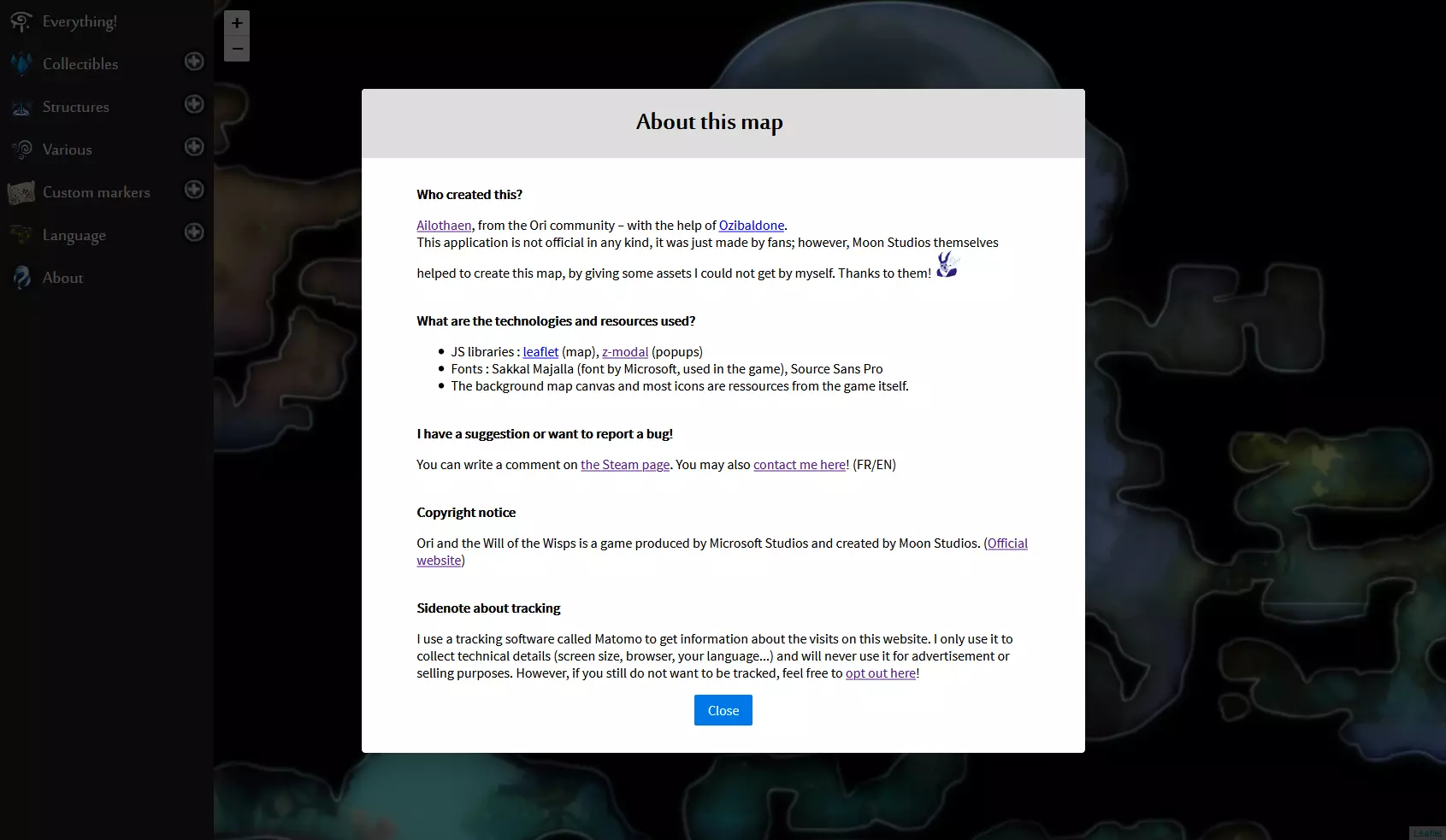 此应用是《奥日与精灵意志》的交互式世界地图,可在网页浏览器中运行(类似谷歌地图)。它包含完整的尼文地图以及所有有趣内容:收集品、重要地点等。支持英语、法语、俄语和德语,通常会为你加载“最佳”语言。使用方法