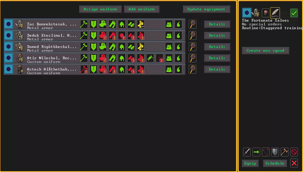 获取铁锭,用它们可以制作成品,为此需要建造铁匠铺。建造铁匠铺需要铁砧。你在游戏开始时不是有铁砧吗?你该不会把它弄……丢了吧?不然就得去商人那里买,或者在劫掠行动中夺取。没有武器的话,很难办。不过我们就当我们有铁砧好了。铁匠铺运作也需要燃料,所以如果你真的决定投身重工业,别忘了储备煤炭。 我们首先要做的,是为未来的军队生产几套盔甲。这有点麻烦,因为不能直接订购整套盔甲,需要分别生产护腿和护臂,但凭借努力和工作指令,你一定能完成。军事事务 好了,现阶段你已经有足够的经验,可以自己去研究其他工坊、制品、资源以及其他各种农场里的麻烦事了。现在是时候去做真正男人该做的事了。要创建军队,我们需要任命一名民兵指挥官。之后就会出现创建小队的功能。为此,点击右下角的旗帜,然后选择创建新小队。你的指挥官将自动被任命为小队队长。点击侏儒头像以添加新的战斗人员。点击装备按钮可以配置装备。