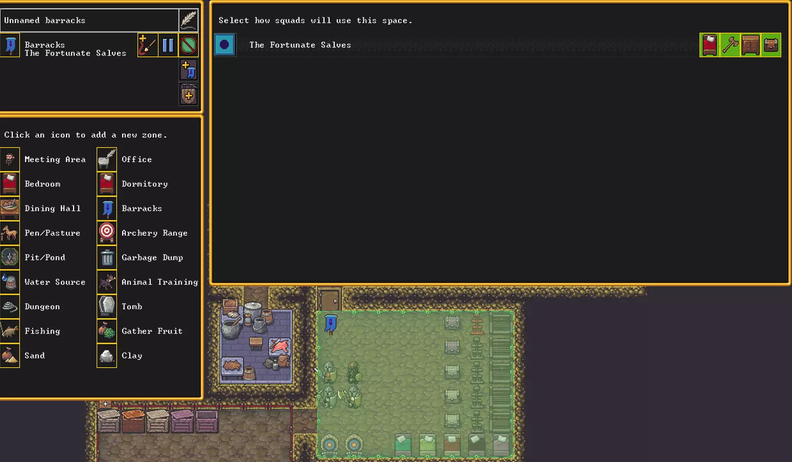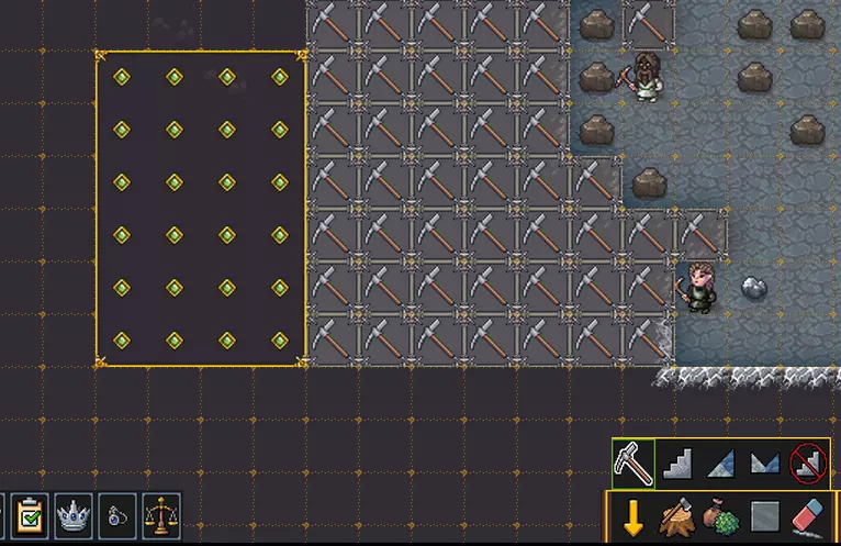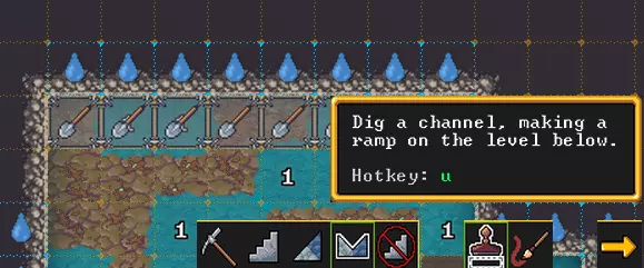 如果你再让她挖掘,工人们会把她挖出来,但之后会发生什么就不好说了,有可能会挖穿地下河的边界,然后你就会被淹没。最好不要碰这些格子,除非你准备好处理水患。 反正我们需要建造仓库,所以就停在水位上方的楼层,挖出一块足够大的空地,并用砖块标记格子。