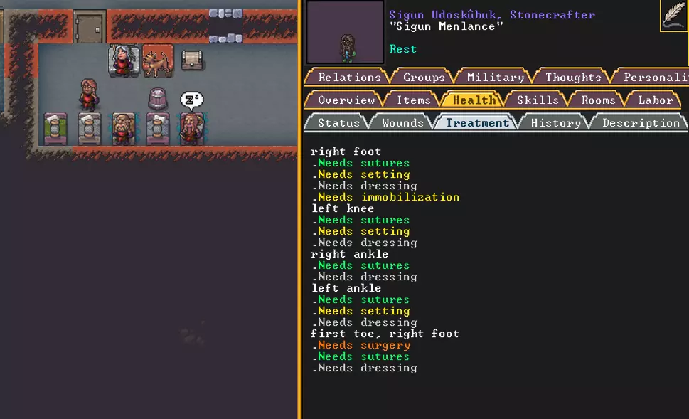 为了正常开展工作,至少需要为不同类型的医生岗位安排四个人。一开始你可能没有具备所需技能的人,不过没关系,就让那些流浪者进行培训吧。如果预计会有大量患者涌入,最好让急救团队从其他所有工作中解脱出来。此外,这里还能看到治疗所需的各种工具,比如针线、布料等等。不用说,这些工具必须时刻保持充足的库存。如果受伤者长时间未得到治疗,可以查看他缺少什么,并采取相应措施。