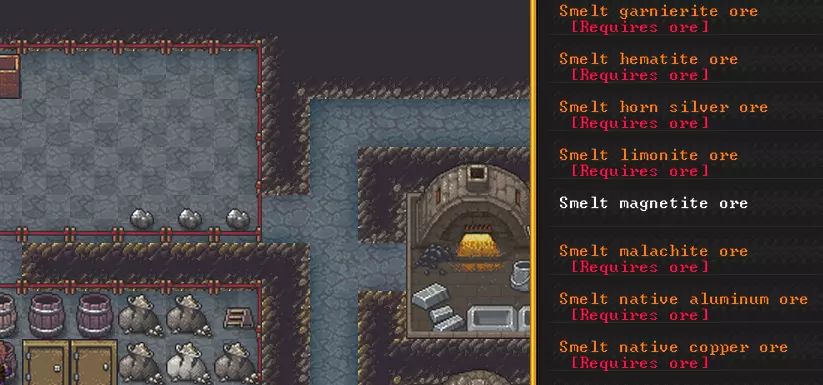 如我们所见,这里有4个季节,每个季节都可以选择种植的作物。蘑菇,蘑菇还是蘑菇?嗯……让我想想。我们的土地当然不怎么样,有传说称在某个深处有更适合种植的地方,但我还没找到。这就留给你了。不过现在,我们先试着用肥料来解决问题(设置为施肥)。 制作肥料需要灰烬。而灰烬可以在木工炉(Wood Furnace)中用木头制作(制作灰烬)。不管你愿不愿意,都得去地面上走走捡柴火,但这比找植物简单。烧出灰烬后,需要建造Ashery工坊并制作potash,不然这一切就没意义了。总的来说,数千种资源和物品的英文名称真的让人头大,我有一半都搞不懂是什么东西,也不知道值不值得做。不过这倒是给了实验很大的空间。总之,如果你有钾肥,就可以下令给菜园施肥,以提高菜园的产量。 当然,我们需要的种子要从厨房和酿酒相关的事务中排除,以免白白浪费。 冶金 除了石器和木器,还可以制作金属制品,尤其是武器和盔甲。毕竟我们不只是要建造家园、采集草药,偶尔也得战斗一下,不是吗?我认为,在挖掘过程中你已经注意到墙壁有着不同的颜色,这意味着它们的化学成分也不同。我们感兴趣的是矿石,比如磁铁矿墙壁(magnetite wall)。