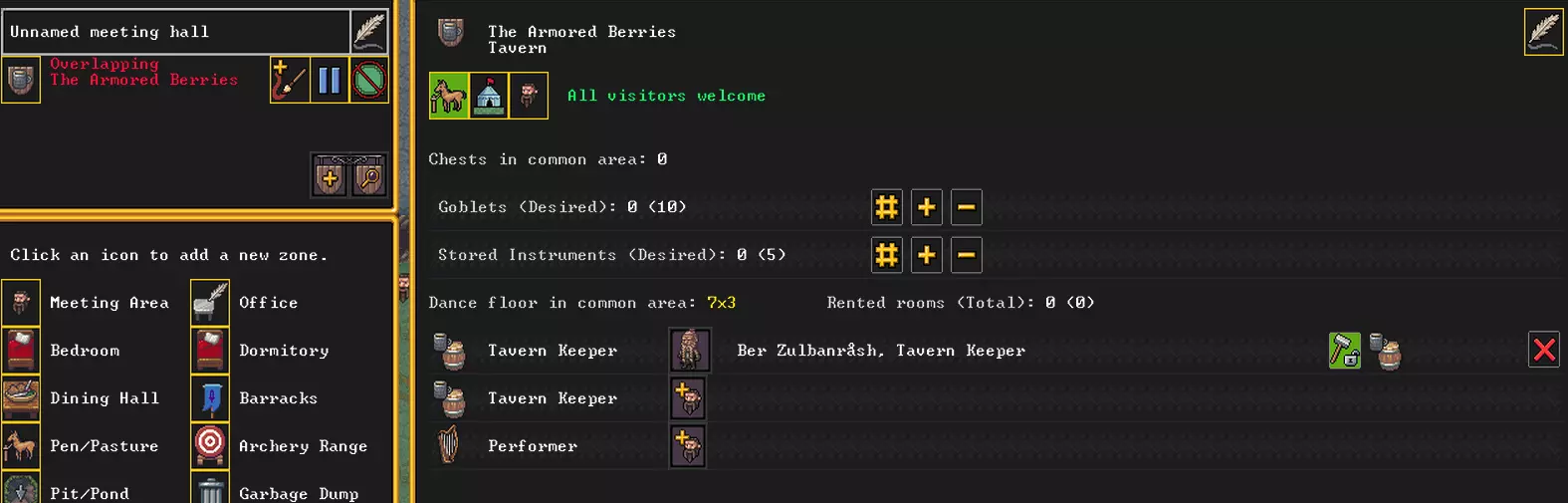 等待生产完成后,在宿舍里摆放好床铺,在食堂里摆放好桌椅,然后分别将它们设置为【宿舍区域】和【食堂区域】,但不将这些区域分配给特定的人,这样所有人都可以在那里活动。 为了增强效果,可以把食堂打造成酒馆,让所有人都能在那里聚集、饮酒和听吟游诗人演奏,从而提升他们的心情。为此,我们同样在上面覆盖【集会区域】,点击加号按钮并选择【新建酒馆】。如果有具备所需技能的空闲人员,可以在那里指派酒保。酒馆里还需要箱子和杯子。箱子的获取方式你已经知道,而要制作杯子则需要【工艺工坊】。