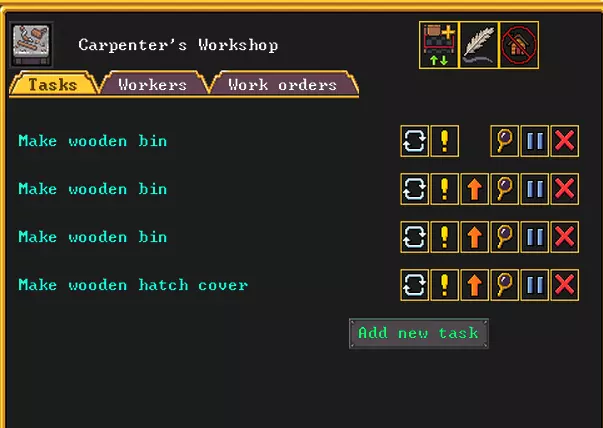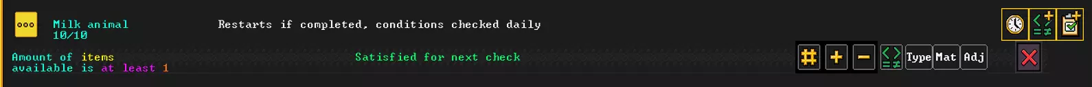 其次,你需要一个农夫工坊。把它建在靠近地表的地方,然后使用工单功能来规划工作。这里我们会用到激活条件。例如,创建一个挤牛奶的指令,并设置激活条件为至少有一头合适的奶牛。可以通过带有绿色图标的按钮添加条件。