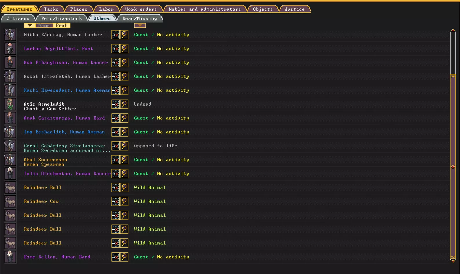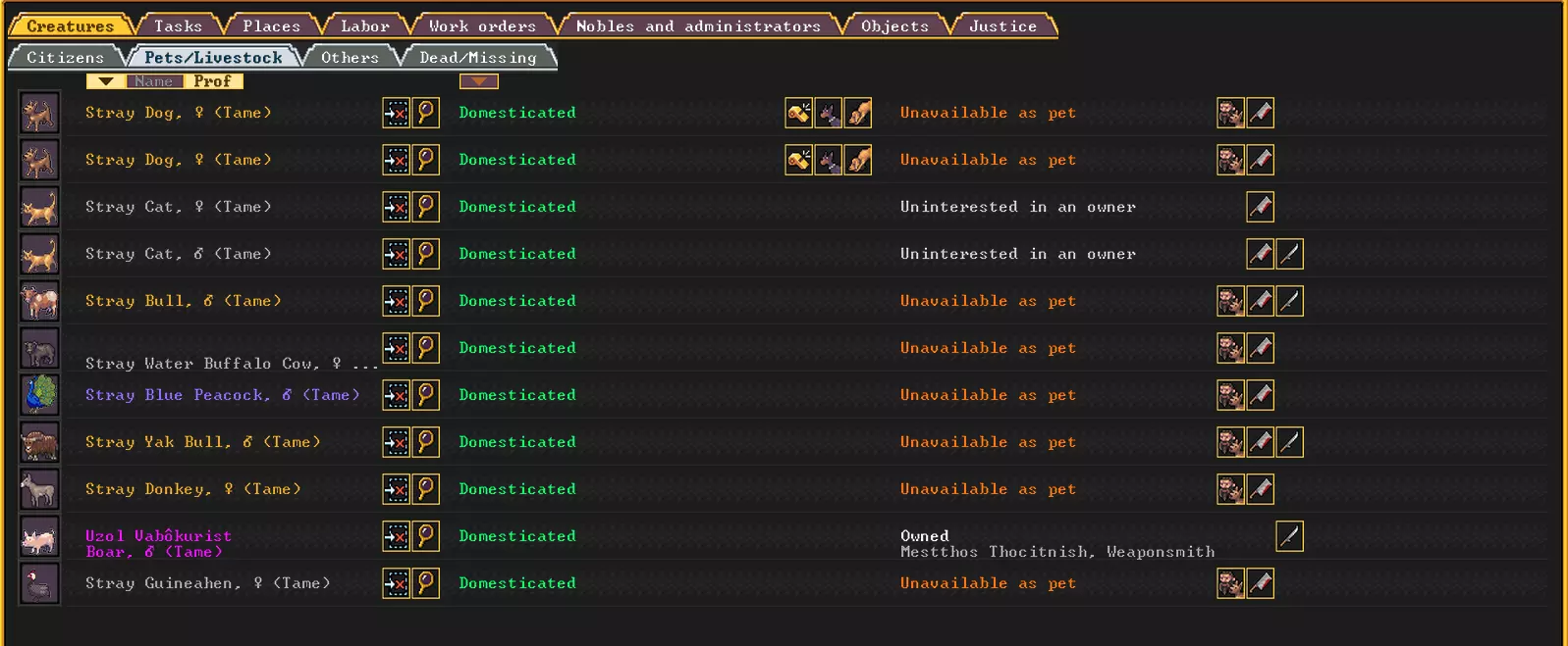 此外,如果仓库中分别有牛奶和羊毛,还可以下达剪羊毛、制作奶酪和毛线的指令。也可以在其他工坊中使用条件指令,例如当仓库中没有空桶和空箱子时,命令木匠制作新的桶和箱子。以此类推。为了更好地了解仓库中各类物品的数量,可以任命一名簿记员并为其建造办公室。第三,你需要一个屠宰场来处理动物获取肉类。为此,你需要进入“生物”菜单,这里会显示你拥有的所有牲畜,然后点击斧头图标。奶牛不需要宰杀,可以挤奶。而肉用公牛则非常适合食用。如果你有不同性别的动物,它们就能繁殖。如果没有,那它们恐怕只有一个归宿——成为一锅汤。或者如果你被带到了没有草的地方,那最好还是把牲畜宰了吃肉,总比饿死强。也可以把猫宰了吃肉,因为它们繁殖速度快得吓人,迟早会让人厌烦。另外,特定角色的宠物是不能宰杀的。