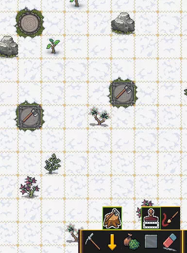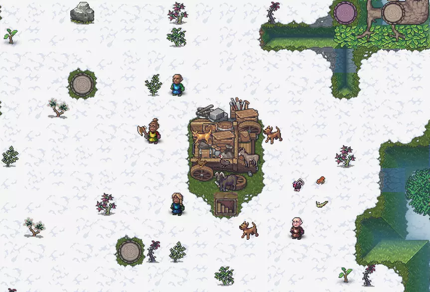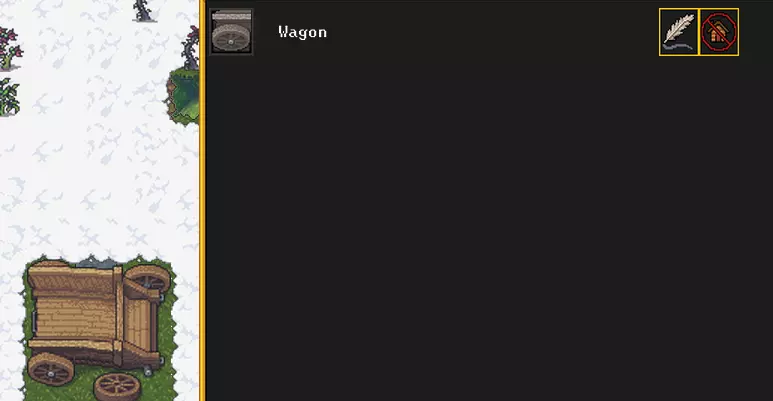 可以微调初始队伍的组成和资源,但默认配置中其实已经包含了所需的一切,所以完成着陆后,就能看到装有杂物的马车、无精打采的矮人、牛和狗都停靠在附近。是时候开始求生了。 搭建庇护所和仓库 首先,我们需要确定一个存放杂物的地方,并把马车上的东西卸到那里,以免被人偷走。为此需要挖掘一个地下空间。如果附近有想要靠近的地形特征,就移动到那里。如果没有,就在当前位置挖掘。操作方法是点击鹤嘴锄和梯子。地图上会出现网格。选择梯子开始的格子,向下滚动鼠标滚轮以下降几层,然后在那里选择结束的格子。