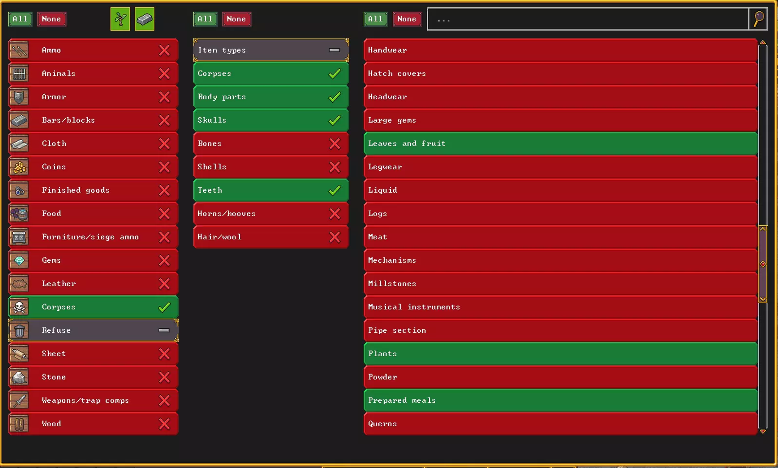 我在这里设置了一下,让骨头和贝壳不会被丢进去,因为可以用它们制作饰品。至于其他像牙齿和头骨之类的垃圾,我也不知道该放哪儿,丢进去又何妨呢?我还往里面添加了一些在特定情况下会变成垃圾的物品,比如变质的食物、枯萎的植物以及其他类似的杂物。这样我就不用手动清理我的主要储物箱了。嗯,差不多不用了。弄清楚哪些东西需要保留、哪些不需要之后,把需要保留的东西妥善处理,剩下的就可以直接扔进垃圾堆了。我们这里的垃圾堆是一个名为【Garbage Dump】的区域,物品存放在这里会占用更少的空间,并且你的矮人无法使用这些物品。要将物品扔进垃圾堆,只需点击垃圾桶图标,然后框选不需要的物品即可。我们在分拣仓库进行操作的好处在于,附近没有有用的物品,也不需要特意逐个挑选。