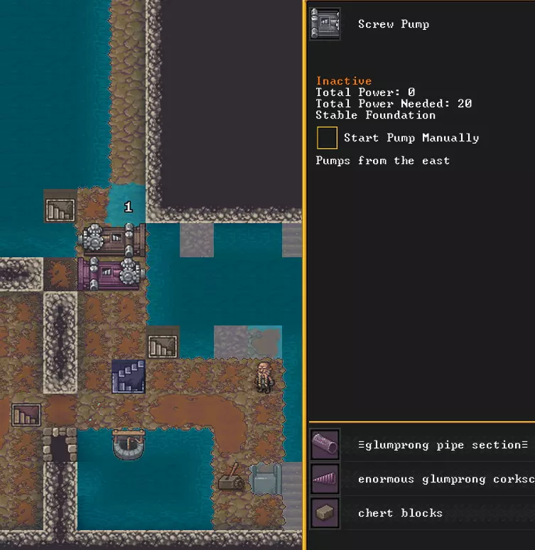 我的闸门由位于上层的拉杆控制,从那里可以方便地观察周围情况。如果我拉动拉杆,水就会流出来。不过需要注意的是,矮人需要时间跑到拉杆处并拉动它,所以不要指望在情况失控时能在瞬间关闭水阀。但在我的情况下无所谓,水在坑里,不会对任何人造成威胁。要想清除房间里的积水,我们需要水泵和另一个位于屏幕稍上方的房间。制作水泵需要两样东西——管道(pipe section)和钻头(corkscrew)。这两样都可以在木匠处用木头制作。水泵占用2个格子,它会从其后端下方的楼层抽水,并从另一端排到当前楼层。或者,如果把水泵的一端对准悬崖,水就会排到坑里。屏幕上的装置用于将液体从一个坑抽到另一个坑,或者反向抽取。因此那里有2个泵。要启动泵,选择它并点击【手动启动泵】,矮人就会跑过来开始抽水。