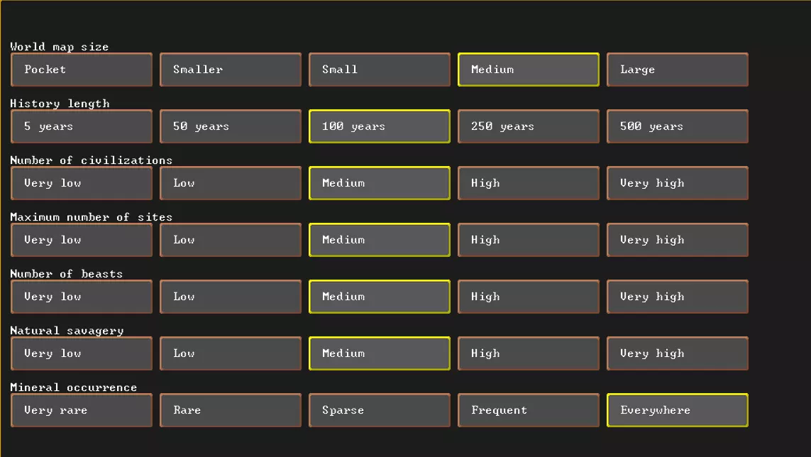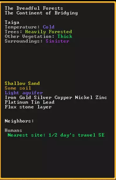 历史长度允许在世界创建后推进一定的游戏时间,在此期间世界会不断发展。相应地,会出现新的城市和角色,既有好人也有坏人,而且他们的数量越多,你遇到他们的可能性就越大,至于最终会怎样,谁也说不准。我认为,如果世界过于空旷,就会缺乏趣味性;而如果人口过于密集,又会给你的电脑带来很大负担,所以或许100年是个比较理想的设定。 地图生成完成后,我们可以选择着陆点。将鼠标悬停在地图上,就能查看各个区域的特性。
