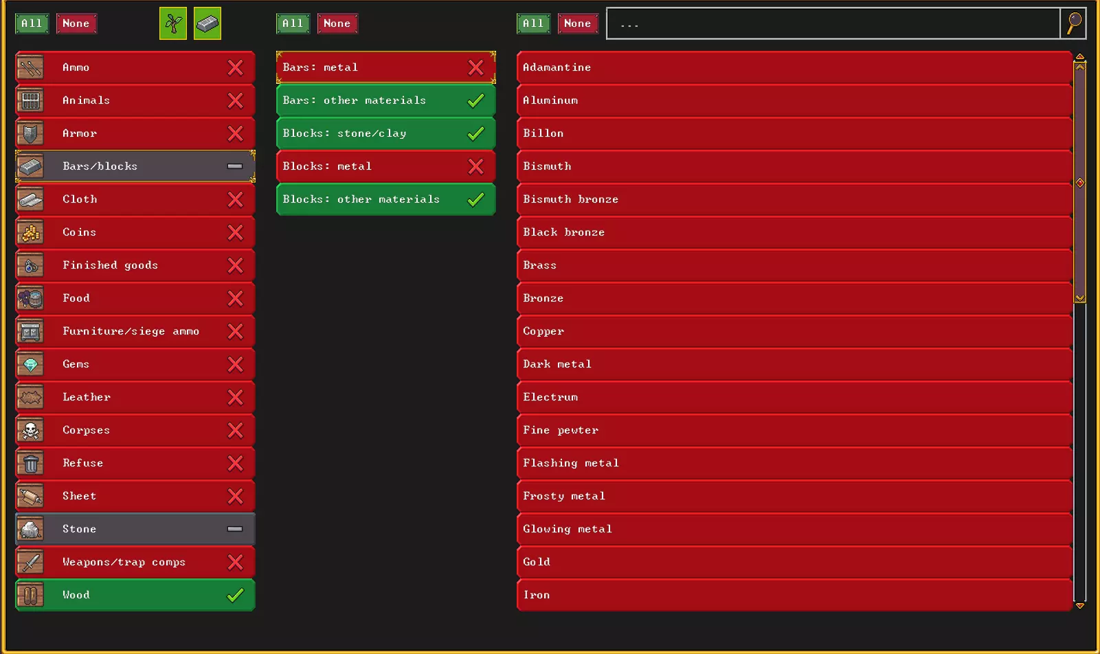 例如,我希望这里存放木材、石头和砖块,但不存放金属矿石和金属锭,我目前没有这些,但总有一天会有的,所以我就这样设置。 另外,通过右上角带有两个箭头的按钮,可以命令将所有相应的物品从另一个仓库转移到这个仓库。我们选择从主仓库转移所有我们需要的材料。