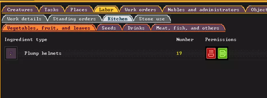 作为小型补充内容,你可以建造鸡窝和蜂巢。如果你有母鸡或母鸭,它们会为你下蛋。如果附近有蜂群,你可以进行养殖。为此,你需要进入制作工坊,分别制作木制巢箱和木制蜂巢。如何放置它们,相信你自己能弄明白。另外,我们可以创建一个菜园,在里面种植我们需要的东西,但这需要复杂的操作和机制,所以先来了解一下这些内容。 烹饪食物 啊对了,为了防止生食材变质,也为了不让你的矮人吃生食,需要烹饪食物。为此,我们可以通过工坊→农业→厨房来进行。为了让生活更舒适,我们还需要酒精饮料,它可以通过工坊→农业→酿酒坊制作。建议将这两座建筑建在酒馆附近,另外在附近再建一个小型的食物仓库,这样食物能更快送到食堂,你也能随时掌握大致的食物数量。看到堆满食物桶的仓库,会有一种独特的满足感。呵呵。 由于我们需要保持食物和酒水之间的资源平衡,所以要设置好资源的分配去向。为此,你可以进入【劳工】->【厨房】进行操作。您可以在选项卡中查看我们提供的产品,并允许或禁止其使用。