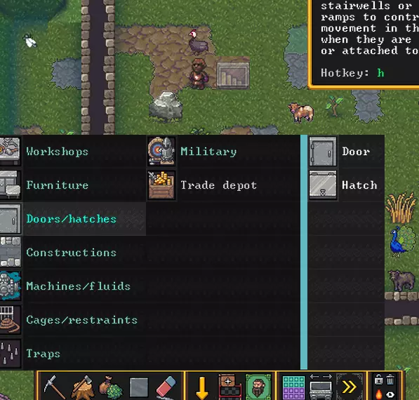 现在你的工人们都会把东西摆放整齐了。木箱也会自动摆放并装满。不过舱口盖需要我们手动安装。 为此,进入建造模式并选择“门/舱口”。要安装舱口盖,需要先制作好并放在仓库里。之后工人会过来安装。