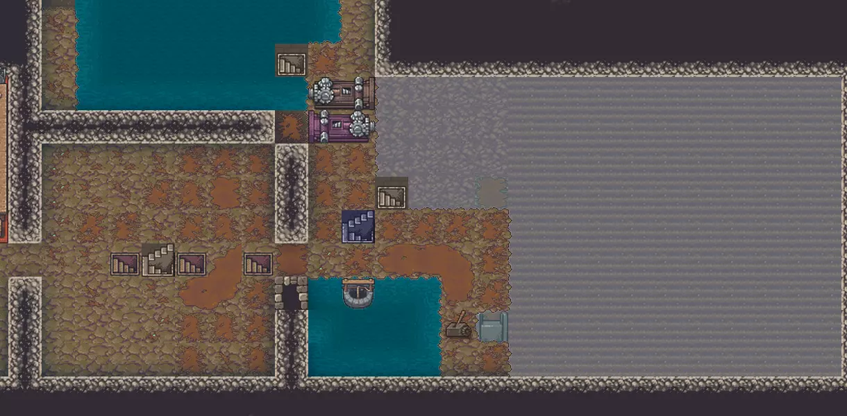 我们正在寻找食物和水源。工作安排已经就绪,接下来要给饥饿的工人们提供食物和水。先从水开始。如果地面上有河流和湖泊,且地面安全,那它们就是显而易见的水源。如果地面不安全,或者由于寒冷气候,水大部分时间处于冻结状态,那么开凿一条从河流到我们洞穴的引水渠会很有用。不暴露在空气中的水不会结冰,敌人也无法爬进来。不过那些不需要呼吸的敌人除外,比如僵尸。但可以用格栅(Grate)挡住这类敌人通过排水管道进入。 所有从河流排水的工程最好在冬季进行,因为那时河水已经结冰。要是不小心挖错了地方导致漏水,可能来不及阻止,整个殖民地都会被淹没。如果没有河流,或者由于气候严寒河水从不解冻,蓄水层(Aquifier)可以为我们提供帮助。如果我们知道蓄水层所在的高度,就在其上一层建造房间,然后使用“向下挖掘”按钮在房间内挖掘坑洞。