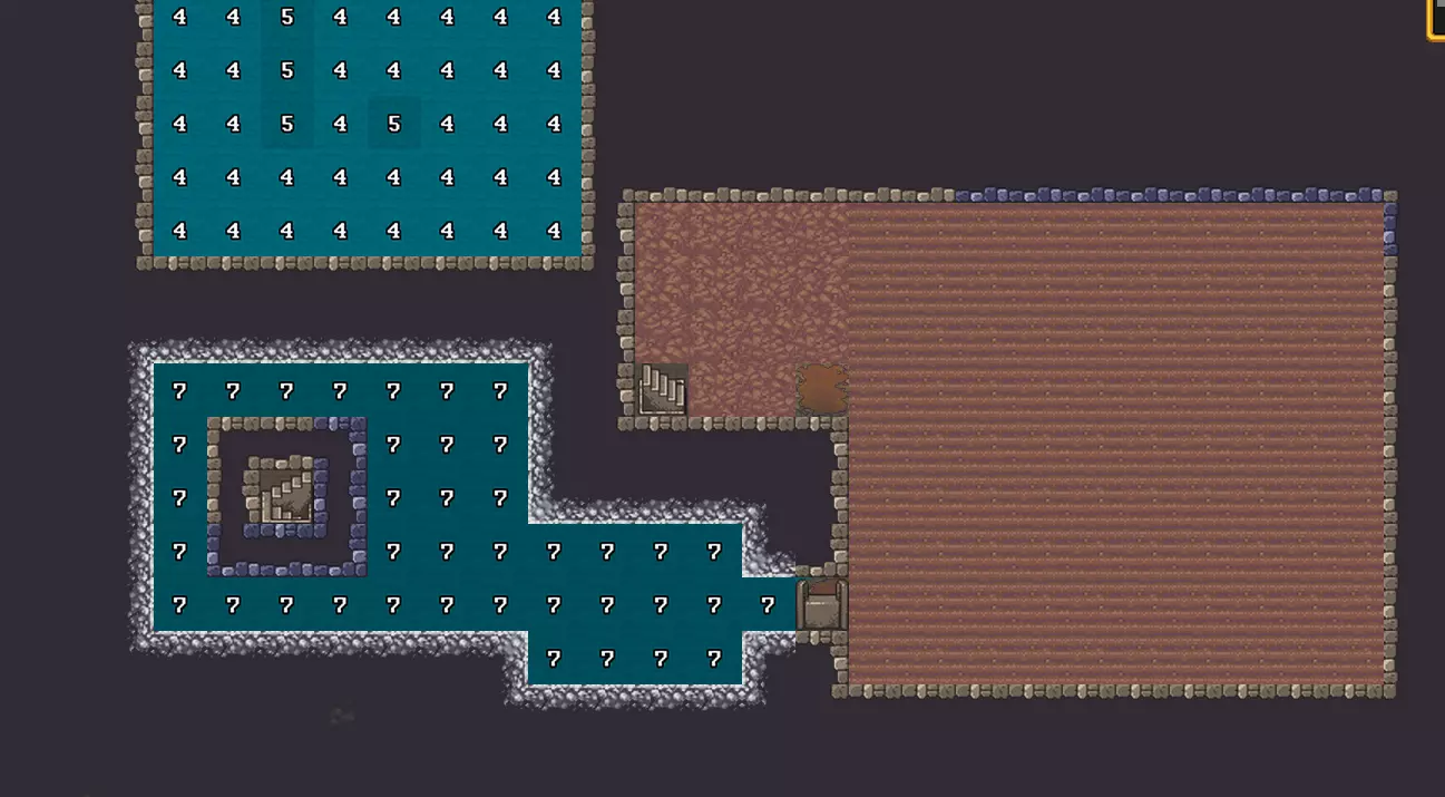 加固墙壁也可以仅仅是为了美观,以提高居民的满意度,但在我们的情况下,这具有实际意义。如果墙壁不是石制的,就无法加固,需要将其拆除,然后通过【建造】->【墙壁】在原地建造石墙,这种墙壁默认不渗水。 注意水面上的数字,可通过小地图旁带#的按钮开启。这些数字显示水深。1表示地面上无害的小水洼。水位达到2时就会对部分工作造成阻碍。当水位达到4时,矮人已经有溺水的风险。精灵和人类由于体型稍高一些,可以在水位5-6时移动。水位7意味着该格子已被水填满,无法站立。 总之,挖掘到含水层后,可以建造一个蓄水池,它会逐渐被水填满。