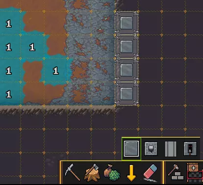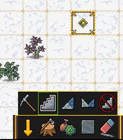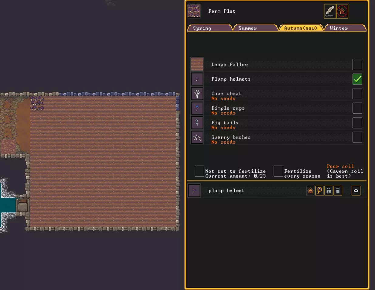 游戏中的其他机制也遵循同样的原理。你可以建造一座通过拉杆控制升降的桥梁,也能让门通过拉杆开启。总之,我们为你添加了拉杆联动功能。尽情享受,大胆实验,最重要的是别淹死。 菜园 无需再冒着被怪物攻击的风险在森林里四处寻找植物,你可以在方便的地方为自己打造一个舒适的小菜园。如果地面安全,原则上可以在任何地方开垦土地种植作物;但如果地面不安全,就必须在地下建造种植区域,而在地下并非所有作物都能种植,主要是各种蘑菇。 总之,通过前一章所述的简单水操作,我们得到了一个满是泥土(pile of mud)的房间。接下来进入“工坊”->“农业”->“农田”,将农田铺设在泥土上。现在就可以在这里种植作物了。