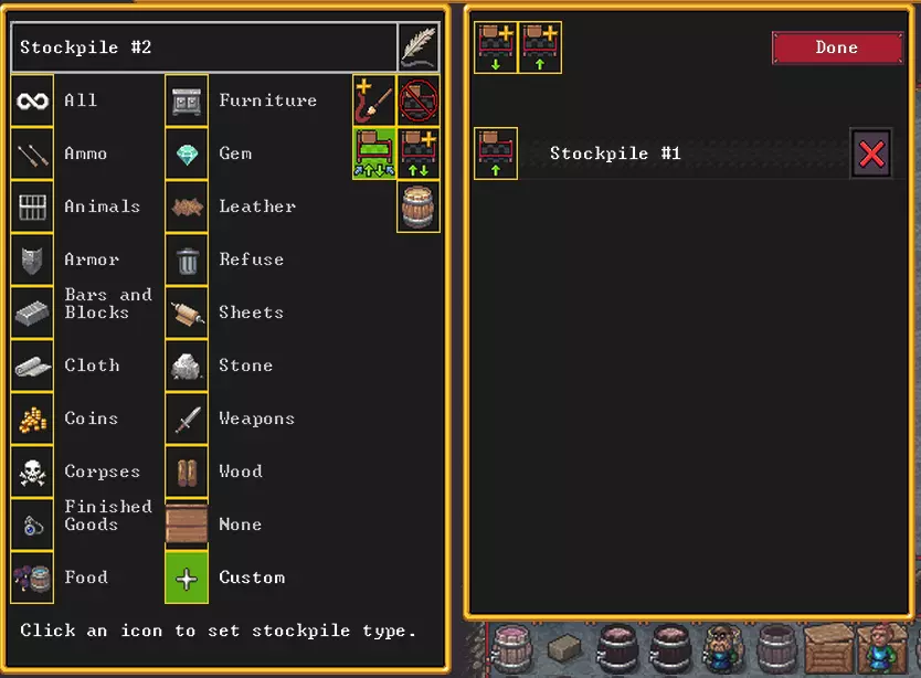 我们来看看石匠职业,该职业可以用石头制作许多原本可用木头制作的物品,所以这完全取决于哪种资源对我们来说更容易获取。由于木材生长在地表,收集起来可能耗时且存在危险,而随着挖掘工作的进行,石头会不断大量涌现并占据空间。因此,我首先建议用石头来制作各种柜子和桌子。另外,值得一提的是【制作岩石块】这一功能,它可以将鹅卵石加工成建筑砖块,这些砖块可以存放在【木质储物箱】中,从而不会占用太多空间。你现在就可以着手处理这件事。 在当前阶段,你可能会想要对自己的仓库进行一些分类整理。首先,这能稍微减轻主仓库的负担,主仓库将是主要活动的场所;其次,你可以通过查看专用仓库快速了解各类资源的数量,而不必在杂乱的总仓库里翻找;第三,特定资源最好存放在靠近特定工坊的位置。 那么,假设我们想把建筑材料分出来,存放到单独的仓库里。挖掘房间,在那里创建仓库,并在用途中选择自定义。随后会打开详细设置窗口。