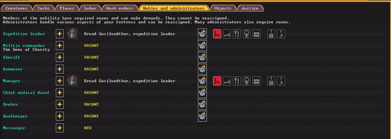 好了,基础生产已经理顺,接下来得继续推进我们的事业了。 任命经理,打理日常事务 手动点击每个物品的生产有点累人,对吧?幸运的是,这里有很大的自动化空间,但要让它们运转起来,我们需要一位经理。 要任命某人担任这个职位,请进入【贵族与管理者】菜单(带有皇冠图标的按钮)。这里有几个职位,但除了探险队队长外都是空缺的。我们感兴趣的是经理职位。点击加号,会看到从最佳到最差的合适候选人列表。结果显示,最合适的人选是我们的探险队队长。好吧,就让他同时在这里工作吧,这样也行。我们将这个职位任命给他。