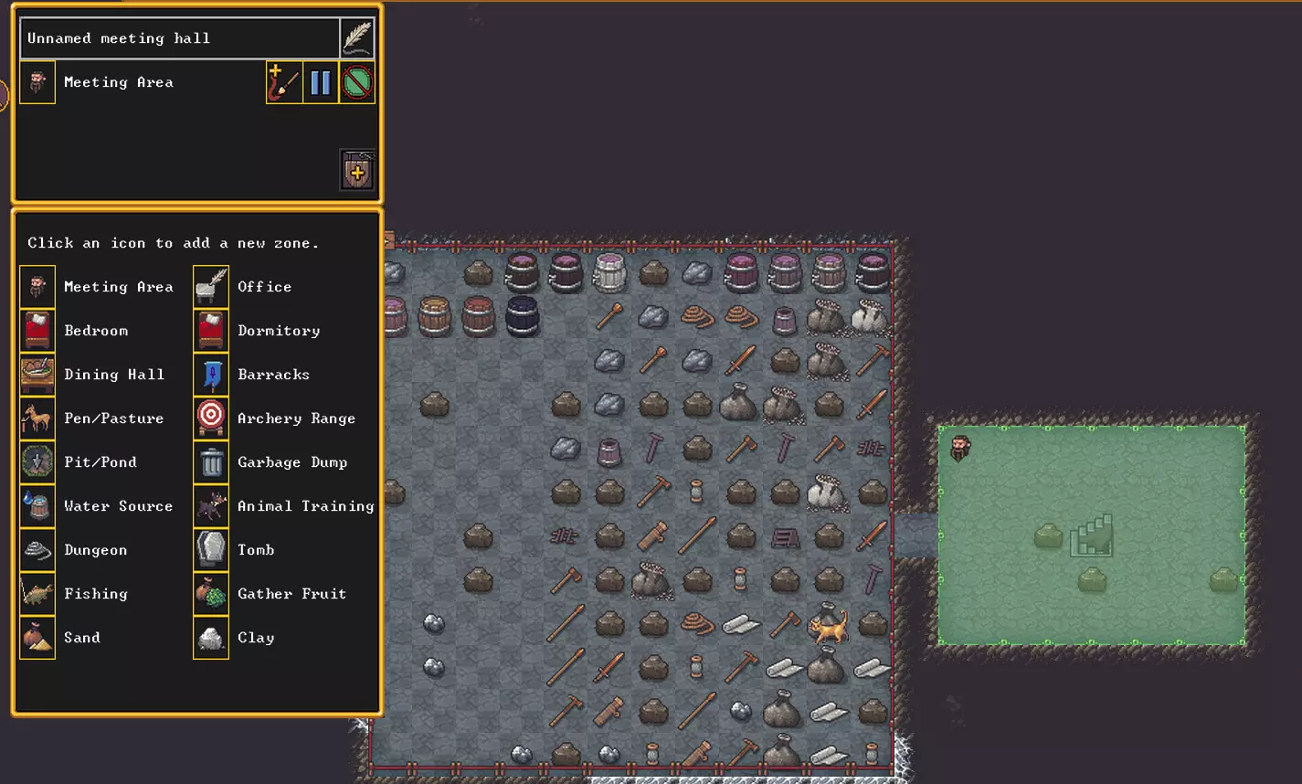 你的矮人会自动将他们认为有价值的所有物品搬运到仓库,而他们认为什么有价值则取决于后续会提到的设置。目前我们只关注马车里的物品和堆积的石块。 此外,需要确定一个集合地点,这样大家就不会聚集在马车旁的初始位置,如果该地区有敌人的话,这会引起敌人的注意。目前,楼梯附近的空间就很合适。集结点的创建原理与仓库相同。点击带有麦穗的绿色按钮,选择【集结点】(Meeting Area)并将其放置在空地上。还有其他区域,我们稍后再进行介绍。