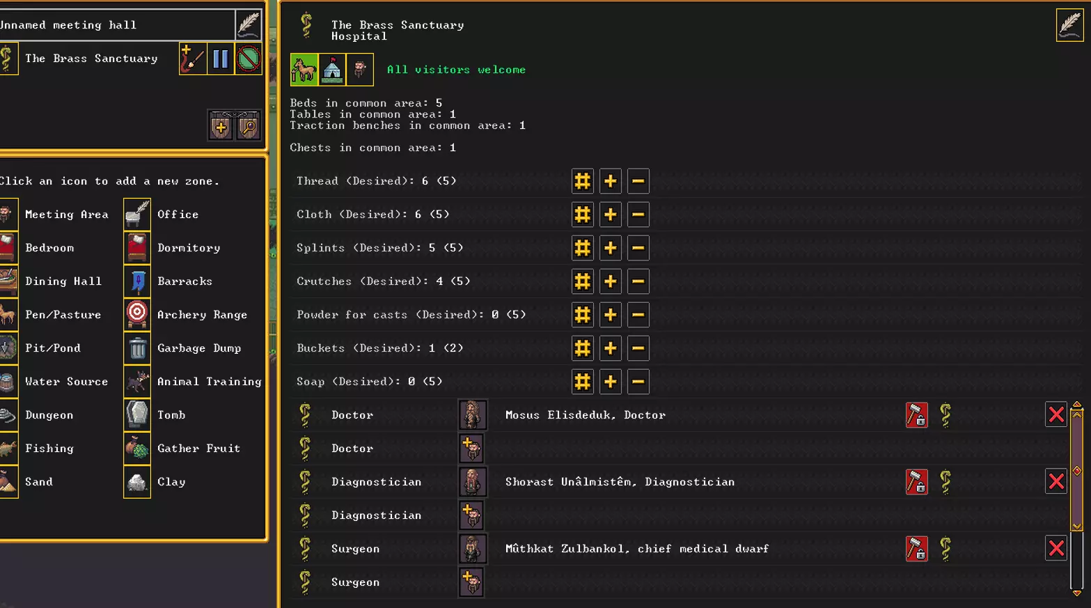 多可爱啊,小家伙跑到避难所的大门外玩耍了。而且还没法把他弄回来。你们觉得,如果发生辐射泄漏,我不得不紧急关门的话会怎么样?达尔文会表示赞同的。 医院 那些有幸在与敌人的遭遇中活下来的人,还有机会通过医疗机构挣扎求生。要创建它,我们需要一个配备床、桌子、手术台(由机械师制作)和器械柜的房间。在房间上划定会议区域,并将其升级为医院。 为使其正常运作,需要任命首席医疗矮人。之后查看相关设置。