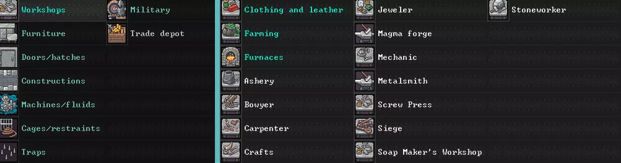 好了,你的财产和市民都处于相对安全的状态,可以继续处理正事了。 建立最基础的生产 我们用马车运来的东西,显然不足以维持生计,所以我们需要开始自己生产物资。为此,我们需要工坊。我们首先需要的工坊是木工坊(Carpenter)和石匠坊(Stoneworker)。工坊为3x3格大小,因此需要挖掘出所需空间,同时别忘了确保能方便地访问仓库,以及考虑到后续我们还会进一步扩建。