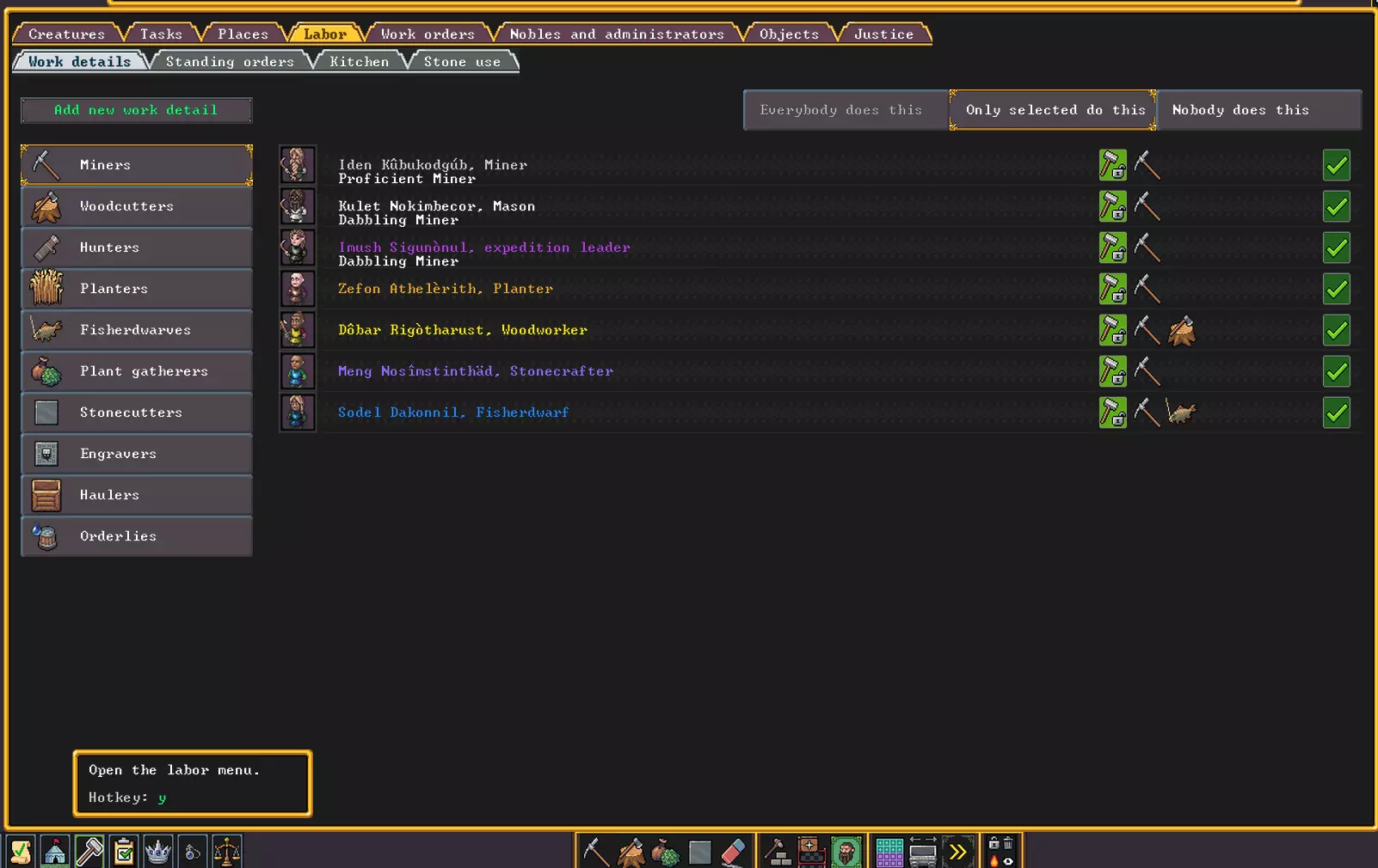 为了加快进程,进入劳工菜单,将所有在场人员分配到挖掘工作中。在这里还可以确定谁将执行或不执行其他哪些工作,这很容易弄明白。当我们有很多人手时,可以根据他们的技能和偏好来分配专门的人员。但目前我们只有7个流浪汉,每个人都得多少分担一些各种工作。