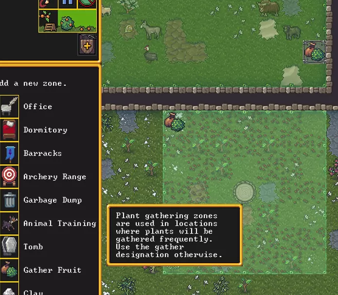 过一段时间后,坑会注满水变成可以饮用的水池。口渴的矮人很可能会自己找到水,但你也可以通过设置【水源区域】来帮助他们。如果你不希望他们在整个地图上寻找其他水源,可以进入【劳动】->【常规指令】->【其他】,将其设置为【只从指定区域饮水】。通常在这些标签页中有很多实用的自动化选项,建议你花时间研究一下。游戏中的食物来源有多种。 采集。 最简单的方式就是去采摘花朵、果实、苹果、梨以及其他生长在地面上或从树上掉落的东西。此时最好选择安全的区域,否则就只能在守卫的保护下进行这项简单的劳作,或者干脆放弃。不过我们假设一切正常。因此,我们前往地表,点击【设置植物采集指令】并圈选一片区域。适合采集的灌木丛会被高亮显示。此操作是一次性的,每次需要灌木丛时都需重复进行。