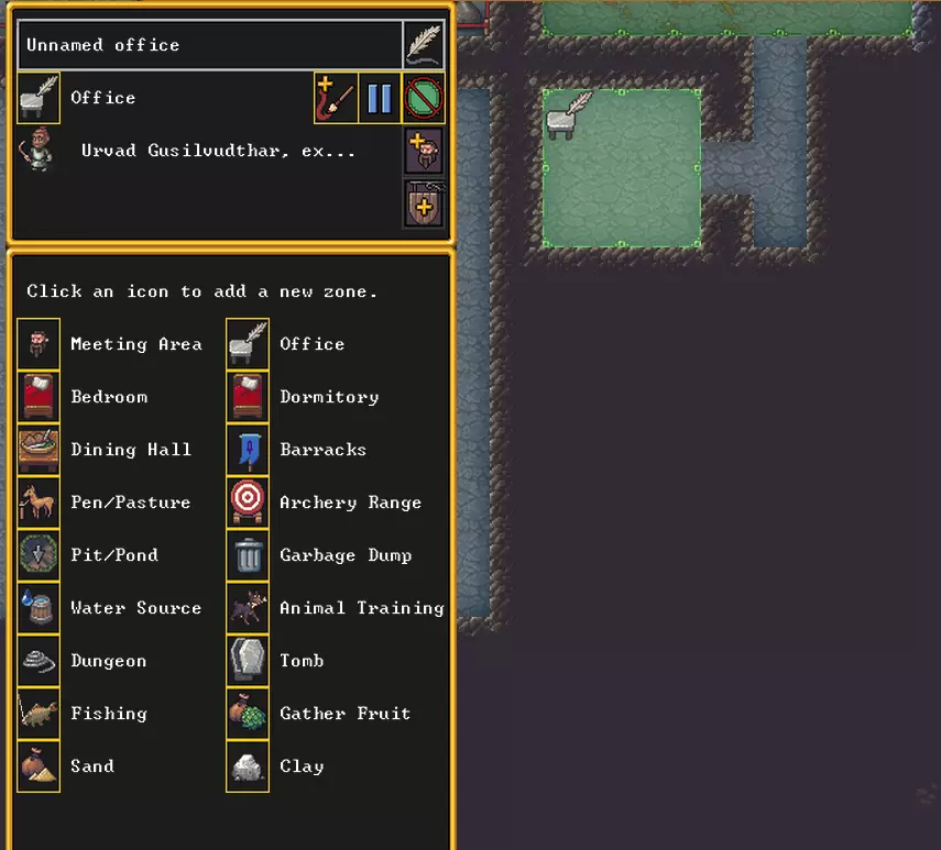 红色椅子图标表示该椅子需要办公室才能正常运作。我们来创建一个办公室。挖掘一个3x3的小房间,进入之前创建收集点的区域,将该房间划定为办公区。通过带有镰刀和加号的按钮,将这个办公室分配给我们的领袖。