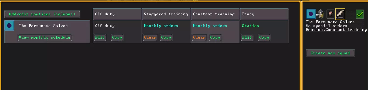 你也可以修改这些模板的参数。例如,我修改了“就绪”模板,让士兵们不在兵营集合,而是在避难所入口处集合,这样如果我在投放期间急需开门,僵尸破门而入时,士兵们就能立即向这些坏蛋发起攻击。 除了日程安排,你还可以通过底部的按钮直接下达命令。比如击杀特定目标、守卫地点、进行巡逻等。红圈会取消快速指令,恢复为按日程设定的行为模式。 如我们所见,操作起来很简单。更难的是把一个平民小丑培养成合格的士兵。要判断他的能力如何,可以看他的战斗技能。