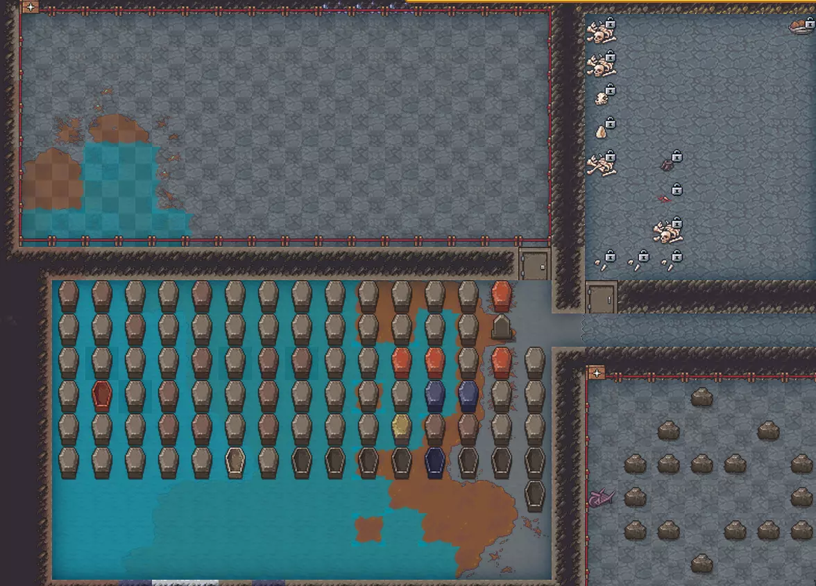 但即便如此,尸体也总会以各种方式出现,你必须处理掉它们。而且最好处理得当,因为不安的死者往往会以幽灵的形式复活,四处作祟,降低居民的满意度,甚至让他们气得心脏病发作。 首先,我们需要棺材。用石头制作棺材比较便宜,反正石头有的是。当然,还需要空闲的空间。把棺材摆放好。当我们需要埋葬某人时,创建一个【坟墓区域】并在其中选择一个棺材。注意,不是多个棺材,也不是整个房间。然后将逝者指定为该区域的所有者。在列表中,他们会被标记为【已故】,所以很容易找到。如果你在分拣仓库里有待埋葬的客户,只要取消游戏暂停,该区域就会自动填充。 对了,分拣仓库,也就是临时停尸房,我提到它是有原因的。当你需要区分重要事物和无关杂物时,它非常方便,比如区分重要的尸体和不重要的东西,以及你的同伴们从每个战场带回来的各种垃圾,像骨头、角、蹄子、断肢、弹壳之类的。为了不让它们占用主要仓库的空间,也为了避免你那些规矩的市民看到尸体、闻到尸臭而降低满意度,我们可以在远离主要活动区域的地方设置一个仓库,并将其配置为接收所有尸体和部分垃圾。