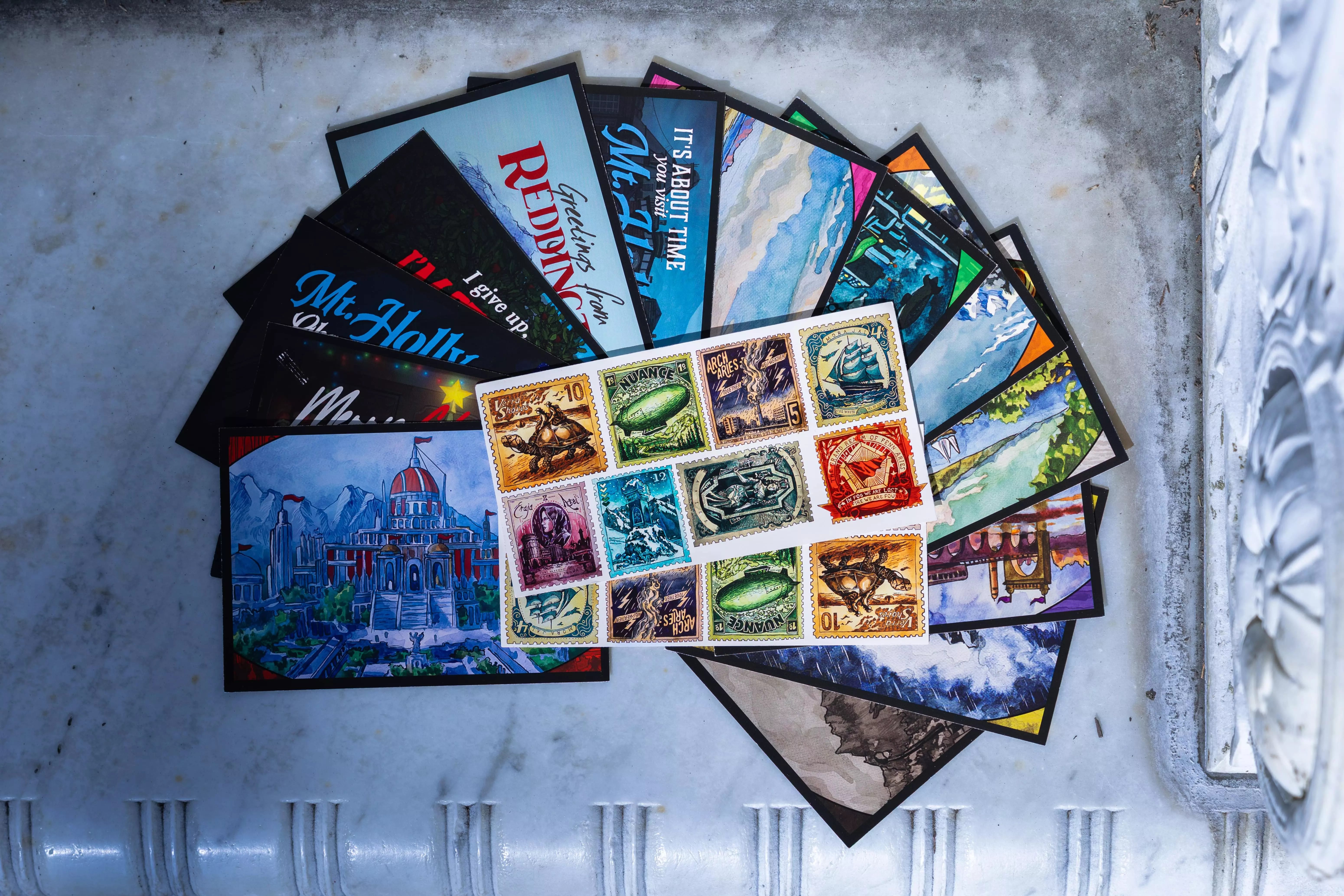 蓝王子邮票与明信片套装 一套包含13张厚卡纸明信片,1:1还原了玩家可在霍利山的抽屉、垃圾堆以及【已编辑】区域中找到的部分游戏内明信片和艺术作品。此外,该套装还附带两套共8款独特的邮票主题贴纸。