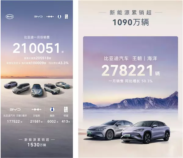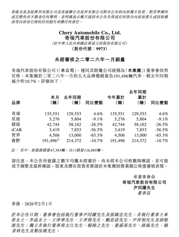 左图为2026年1月销量,右图为2025年1月销量 但需要指出的,比亚迪上个月出口超 10 万辆,同比增长 51.5%,出口占比几乎是全月销量的一半。此消彼长,可以简单算出今年 1 月比亚迪国内销量同比下降了52% 。而出口量的上涨对于比亚迪来说也是好事,在国内购车需求有限情况下,确实要尽快将海外市场升级为 “ 第二战场 ”。 而将出海做得更加出彩的则是奇瑞集团,在其 20 万的月销数据中,有 60% 的车型是销往海外市场,是目前自主品牌出口销量第一名。虽然 “ 出口 ” 确实是帮助奇瑞集团销量大涨的绝对利器,但是,正如和高资本创始合伙人何宇华所说:“ 奇瑞出口国主要为伊朗、俄罗斯以及新兴国家,欧洲等发达国家还待进一步攻克。以及,海外竞争态势也进一步加剧。” 除此之外,奇瑞所面临的困境和前面所提到的还不太一样,目前奇瑞的新能源渗透率仅为 20% 出头,远不及行业整体渗透率。奇瑞倾注资源打造的新能源品牌,如星途、iCAR、智界销量都并不乐观,后两者在今年 1 月销量连同期一半都不如。 虽然在短时间内,奇瑞还可以依靠出海和燃油车撑起半边天,但新能源汽车毕竟是大势所趋,奇瑞还是需要尽快实现新能源转型。