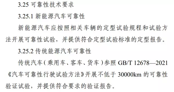 咱不用管这么多,就看这次最大的变化点—— 新加了车辆可靠性技术要求。 可靠性这玩意儿,说白了就是把车子放到各种道路上去跑,跑够一定里程或者一定时间后,看看车子有哪些问题。 这一听就是造车必须的对吧,但之前这项试验全靠车企自觉,各家标准也不一样,有人测得多,有人测得少。 现在工信部是不管你这那的,所有人都必须要做。 具体来说, 现在传统能源汽车需要参照 GB/T 12678—2021《汽车可靠性行驶试验方法》开展不低于 30000km 的可靠性验证试验。
